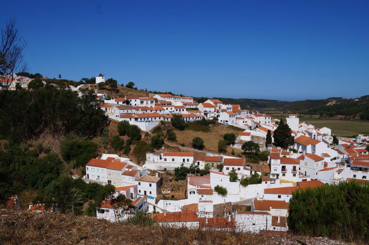 Nach einem kurzen Hinab und Hinauf durch ein Bachtal und weiter durch einen lauschigen Kiefernwald steuern Sie den Strand Vale dos Homens an. Während Weggefährte Esel oben wartet, können Sie auf Stufen zum Strand steigen, der sich geschützt zwischen Felsen befindet. Ob steinig oder sandig hängt immer vom Winter ab, in dem das Meer den Sand gerne mitnimmt und im Frühjahr ganz oder weniger zurückbringt. Weltweit einmalig in dieser Region: Storchennester, die auf Felsklippen sitzen! Familie Storch lässt sich dort im Frühjahr beobachten. Im Dorf Rogil, das von Viehwirtschaft und dem Anbau der Süßkartoffel lebt, können Sie sich eine kleine Erfrischungspause im Café gönnen. War es einst die Erdnuss, verdankt Rogil heute der guten Qualität der Süßkartoffel eine gewisse Berühmtheit und Wohlstand. Jährlich nach der Ernte im Herbst wird sie mit einem großen Fest geehrt. Vom Ortszentrum wandern Sie entlang von Rinderweiden und Kiefernwäldern bis zum Campinplatz Serrão, Ihrem heutigen Etappenziel.