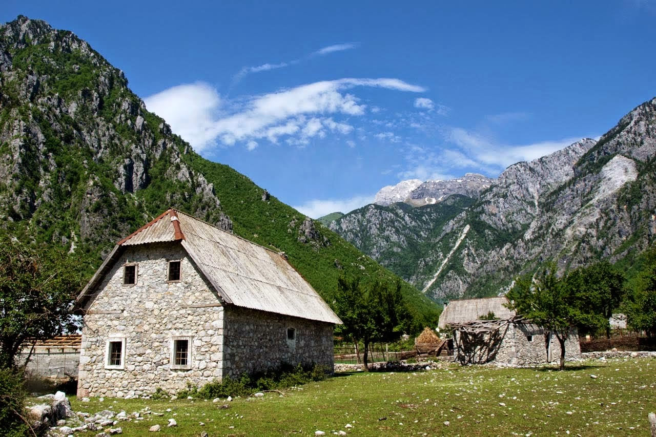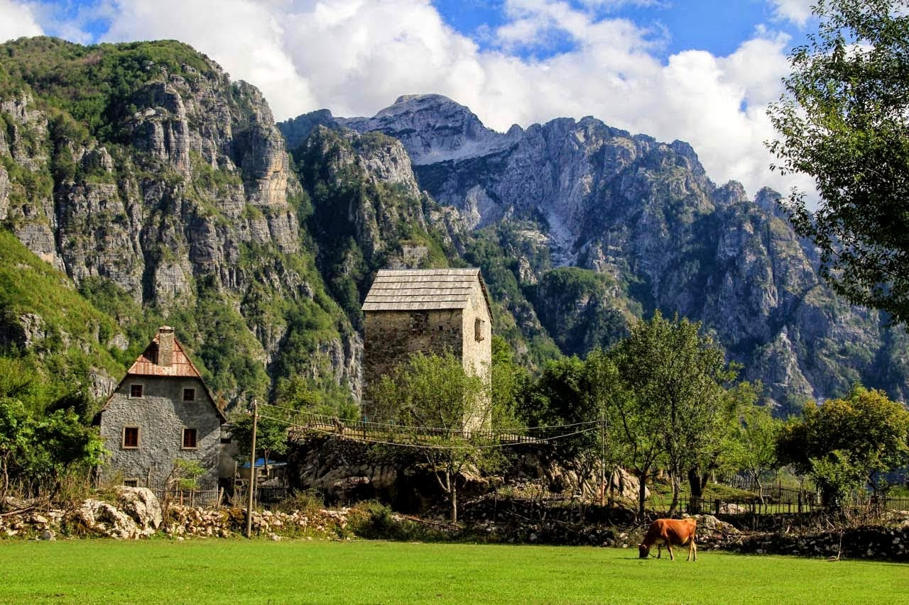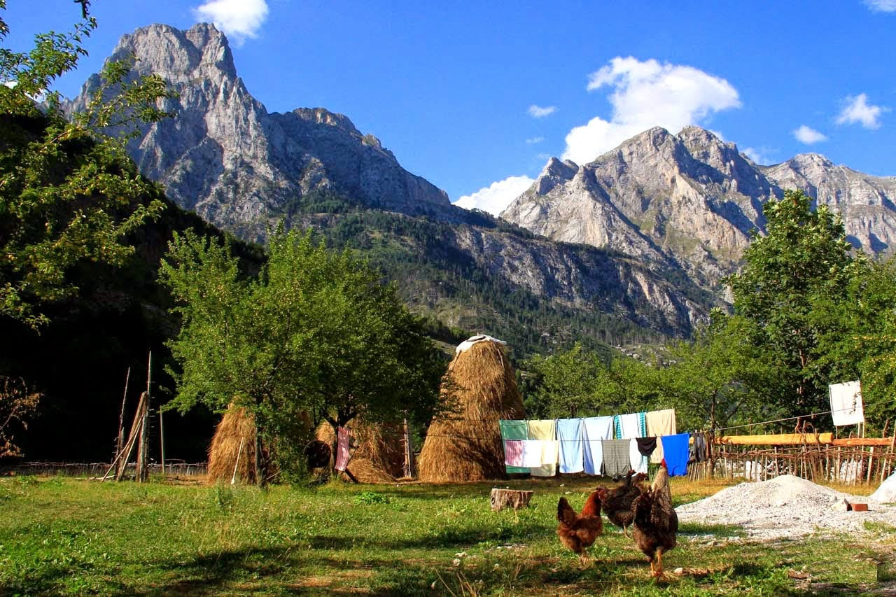 Bei einer Erkundungstour durch das Dorf Theth besuchen Sie die Sehenswürdigkeiten und Wahrzeichen des Tales, die katholische Kirche, den Blutfehdeturm, den Grunas Wasserfall, Klamm und Terrassen. Anschließend führt Sie ein Saumpfad flussabwärts ins traditionelle Dorf Nderlysa, wo Sie die unberührte Landschaft genießen, z.B. bei einem erfrischenden Bad. Hier wohnen Sie auf einem Bauernhof, eine einfachere, aber herzliche Unterkunft, die Gemüse und Obst im eigenen Garten anbaut und alle erdenklichen Tiere hält. Oft sind Sie hier die einzigen Gäste. ↑150m ↓400m ↔ 8 km, Gehzeit 3,5h