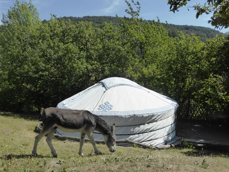 Übernachtung in einer Jurte in Villeplane. Die beiden Jurten, die direkt aus der Mongolei importiert wurden, liegen versteckt inmitten grüner Wildnis. Ein unvergessliches Erlebnis und eine Möglichkeit mit dem ursprünglichen Leben in und mit der Natur in Kontakt zu kommen. -