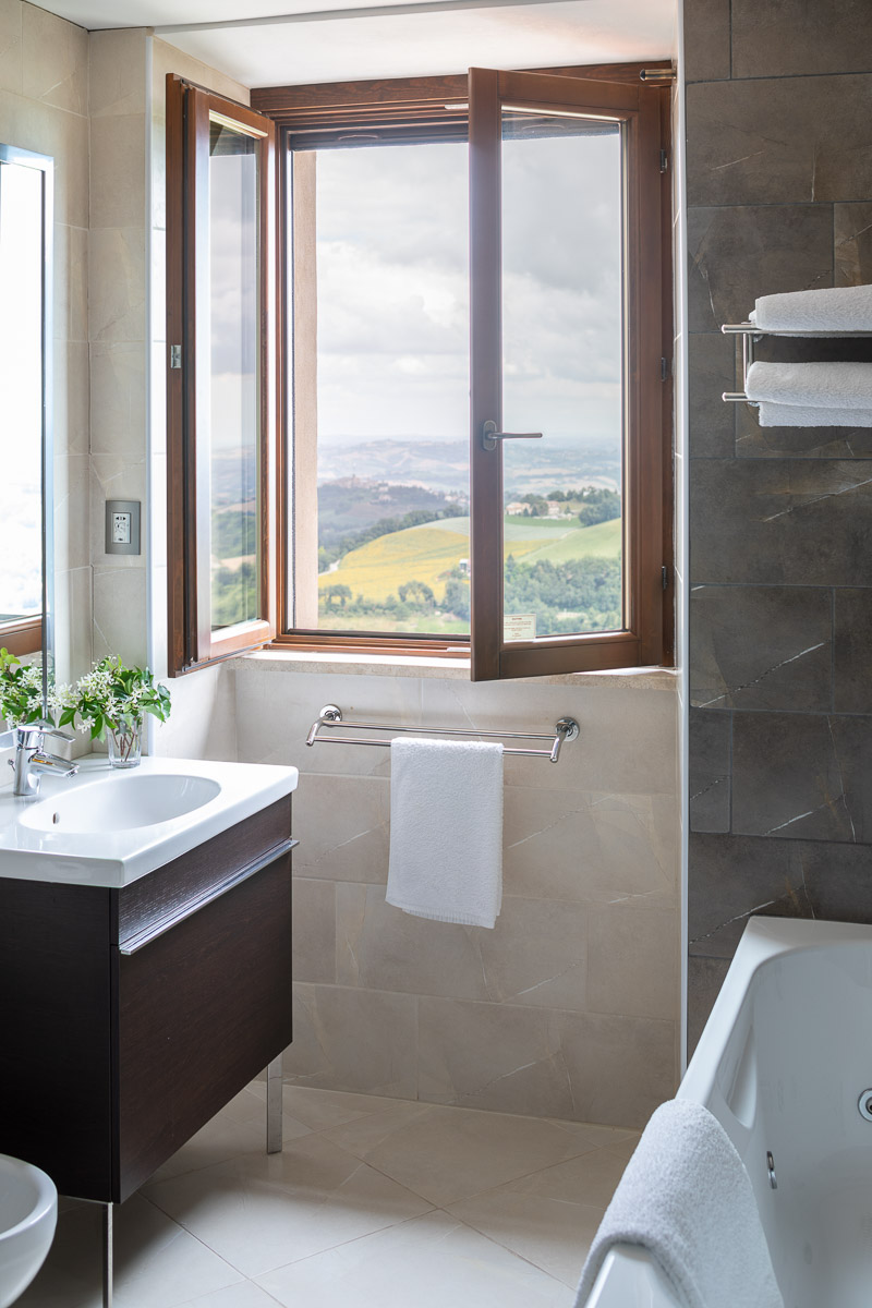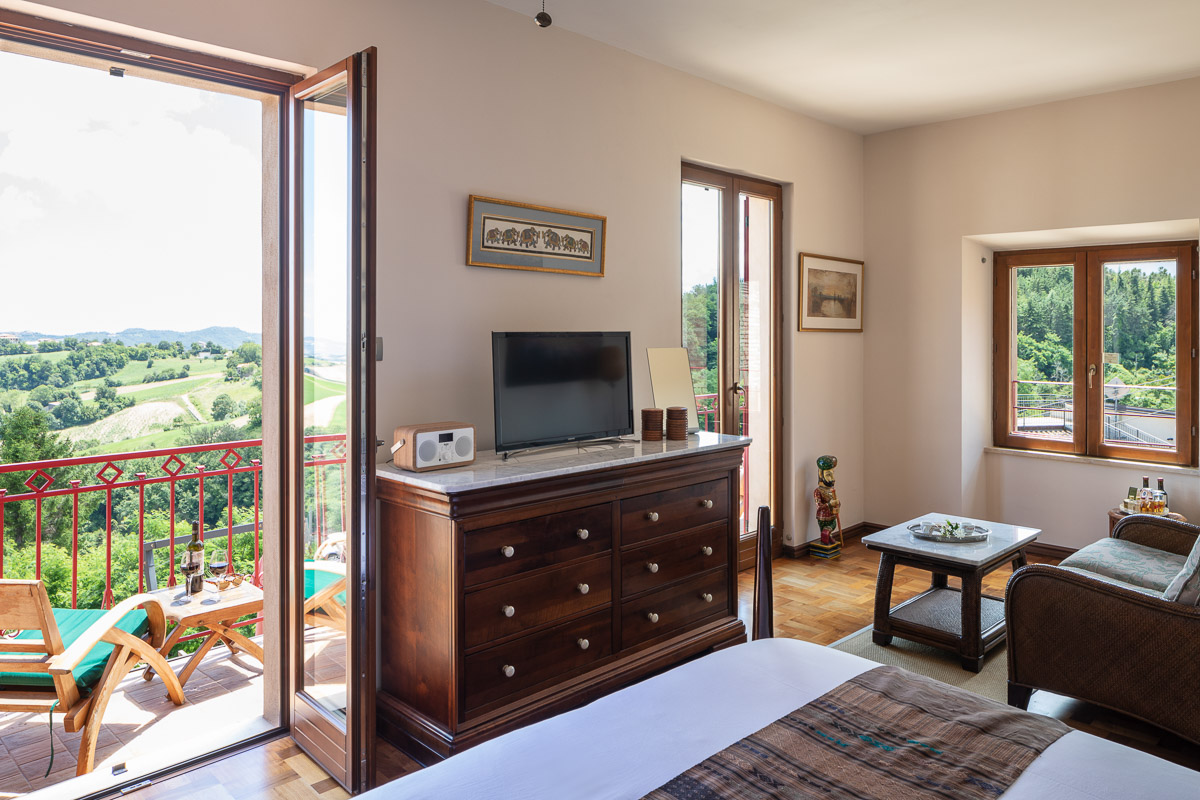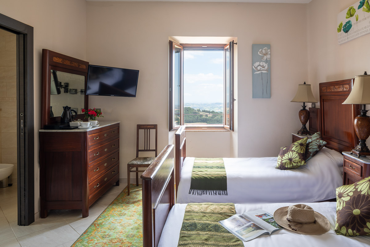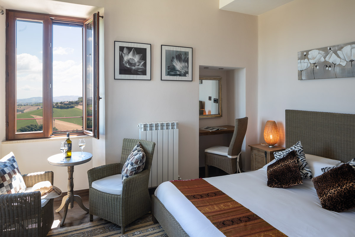 Das Standard Zweibettzimmer ist ca. 31 qm groß. Die Superior Doppelzimmer (27-32 qm) bieten viel Platz und stilvolle Einrichtung für 2 Personen. Der Blick aus den Fenstern der Superior Doppelzimmer geht in die Hügellandschaft der Marken. Die Deluxe Doppelzimmer (27-33 qm) bieten ebenfalls Platz für 2 Personen und haben zudem einen eigenen Balkon mit Blick über die Terrasse, den Innenhof und in die weite Landschaft der Marken. Die Zweiraum-Suiten (ca. 48 qm) bieten Platz für 4 Personen - in einem Raum sorgt ein Kingsize-Bett für erholsame Nächte, der andere Raum ist mit zwei Einzelbetten eingerichtet. Die Junior-Suite (ca. 40 qm) verfügt über ein Super-Kingsize-Bett, eine große Sitzecke, Fußbodenheizung und als ganz besonderes Extra ein Jacuzzi im Bad. Alle Zimmer haben eine Sitzecke, Fernseher mit On- Demand-Dienst, freies W-Lan, Föhn, en-suite Bad mit Dusche/WC und Klimaanlage.