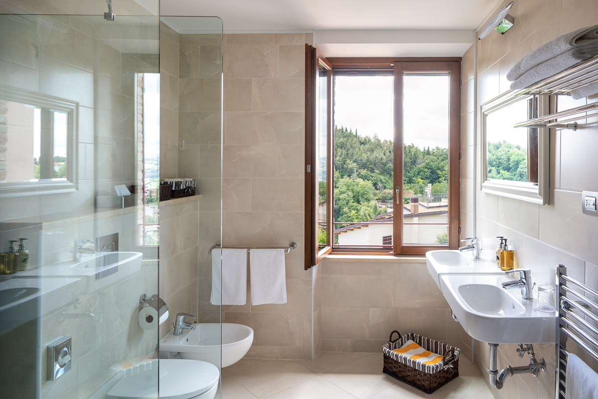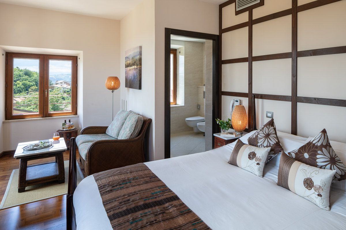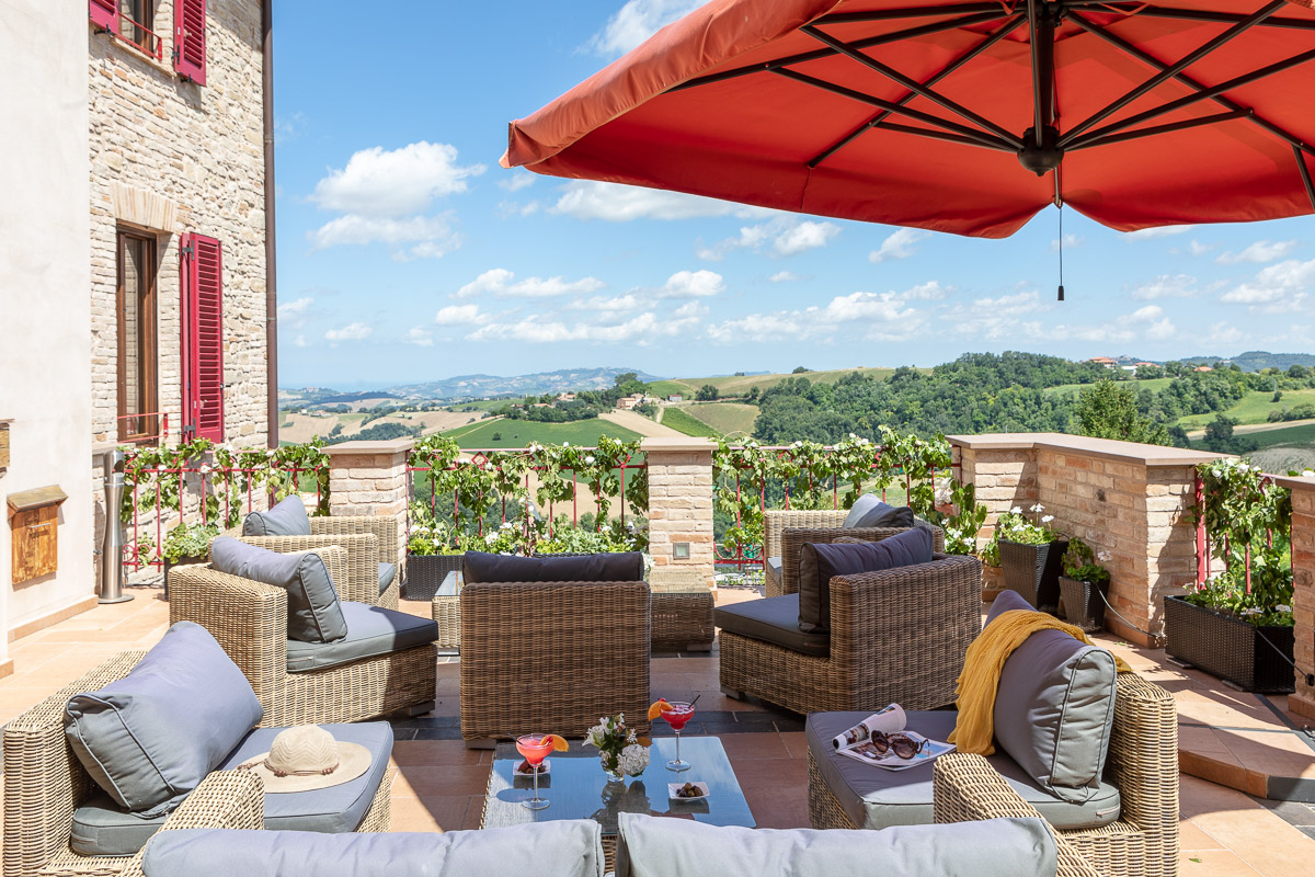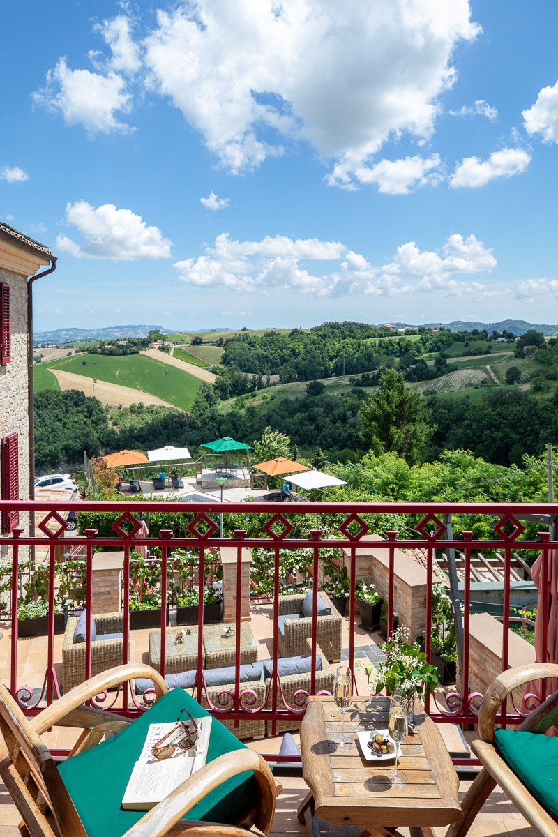 Das Standard Zweibettzimmer ist ca. 31 qm groß. Die Superior Doppelzimmer (27-32 qm) bieten viel Platz und stilvolle Einrichtung für 2 Personen. Der Blick aus den Fenstern der Superior Doppelzimmer geht in die Hügellandschaft der Marken. Die Deluxe Doppelzimmer (27-33 qm) bieten ebenfalls Platz für 2 Personen und haben zudem einen eigenen Balkon mit Blick über die Terrasse, den Innenhof und in die weite Landschaft der Marken. Die Zweiraum-Suiten (ca. 48 qm) bieten Platz für 4 Personen - in einem Raum sorgt ein Kingsize-Bett für erholsame Nächte, der andere Raum ist mit zwei Einzelbetten eingerichtet. Die Junior-Suite (ca. 40 qm) verfügt über ein Super-Kingsize-Bett, eine große Sitzecke, Fußbodenheizung und als ganz besonderes Extra ein Jacuzzi im Bad. Alle Zimmer haben eine Sitzecke, Fernseher mit On- Demand-Dienst, freies W-Lan, Föhn, en-suite Bad mit Dusche/WC und Klimaanlage.