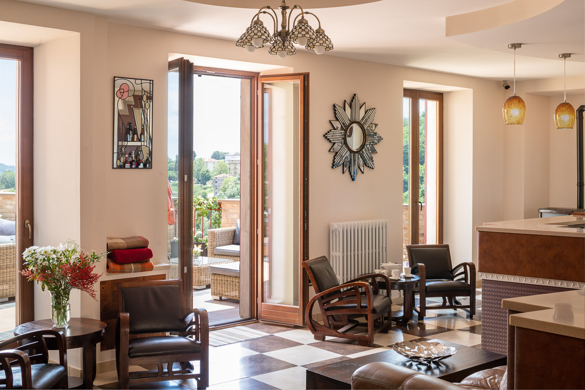 Die gemütlich eingerichtete Bar im Art-Deko-Stil serviert Ihnen jederzeit eine Erfrischung und bietet mit der wunderschön gestalteten Terrasse den perfekten Rahmen zur Entspannung nach einem ereignisreichen Tag mit Wandern, Radfahren oder Kultur. Nachmittags werden in der Bar ein Nachmittagstee und kleine regionale Köstlichkeiten serviert.
