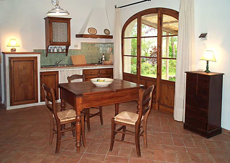 Die mit Bedacht gewählte Einrichtung, die Harmonie der Farben und der Sinn fürs Detail strahlen den Charme und die Wärme des für die Toskana typischen Stils der "Arte Povera" aus. Gleichzeitig wurde jedoch auch darauf Wert gelegt, dass die Räume bequem und praktisch zu nutzen sind. Die Küchenzeilen verfügen über E- Herd, Kühlschrank mit ***-TK-Fach, kleinem Backofen, die Bäder sind mit Dusche, WC, Bidet und Waschbecken ausgestattet. Bettwäsche und Handtücher, sowie Tischdecken und Trockentücher gehören zur Ausstattung. Jede Wohnung verfügt außerdem über einen eigenen Außenbereich mit Tisch und Stühlen, der als schattenspendende Loggia oder Pergola gestaltet ist.