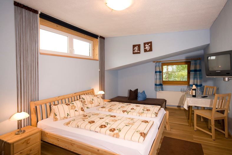 Das familiär geführte Haus ist komplett rauchfrei. Alle Zimmer sind mit Badewanne/WC oder DU/WC, Radio und Fernseher ausgestattet. Insgesamt gibt es ca. 38 Betten. Die Bio-Nester (ca. 25 qm) und Panoramablick-Zimmer (ca. 18 qm), beide mit Holzboden und Balkon, sind zur Süd- oder Westseite gerichtet und bieten Panoramablick auf den Thiersee. Die Bio-Nester sind zusätzlich noch mit Sitzecke und Vollholzmöbeln ausgestattet. Die Spatzennester (ca. 22 qm) sind kleine Mansardenzimmer, ebenfalls zur Südseite, mit Vollholzmöbeln und -boden (ohne Balkon). Die Nordzimmer (ca. 18- 25 qm) sind einfacher gehalten und verfügen auch über Holzboden und Balkon.