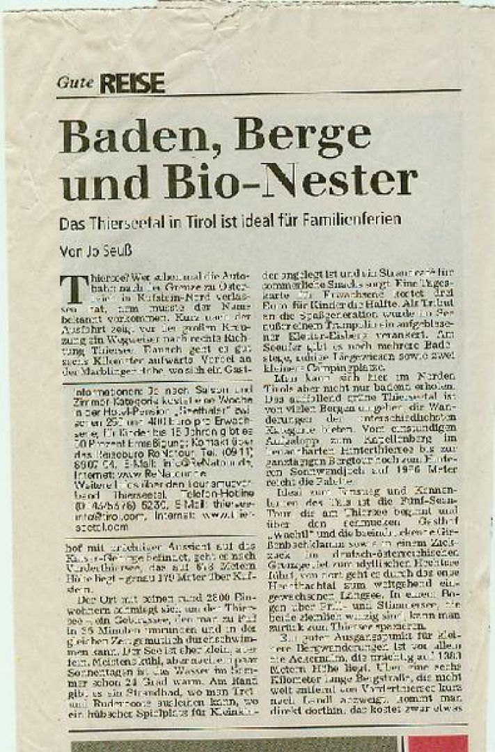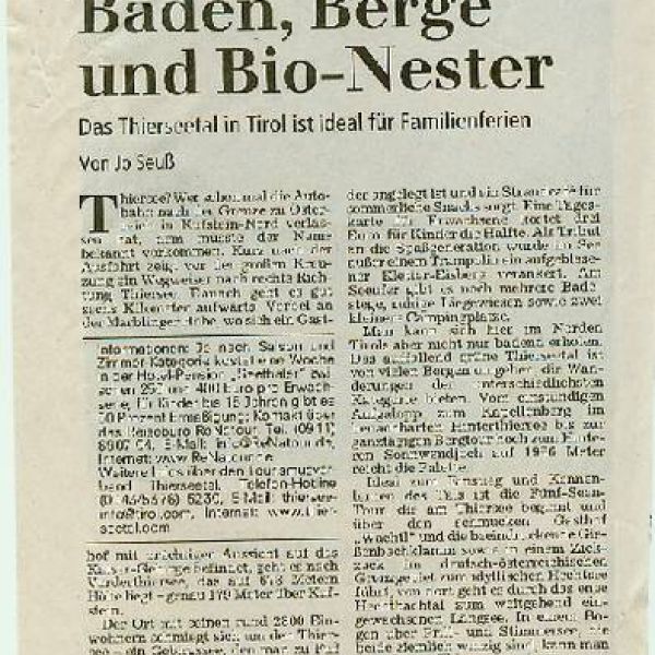 Es war eine rundum gelungene Woche für uns beide. Wir können den Thiersee und das Hotel wärmstens empfehlen.PresseberichteBaden, Berge und Bio-Nester