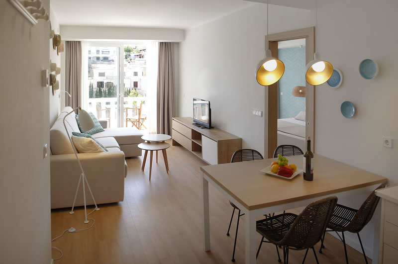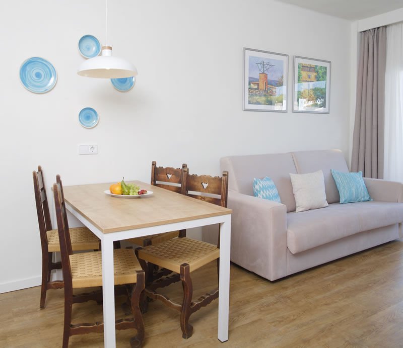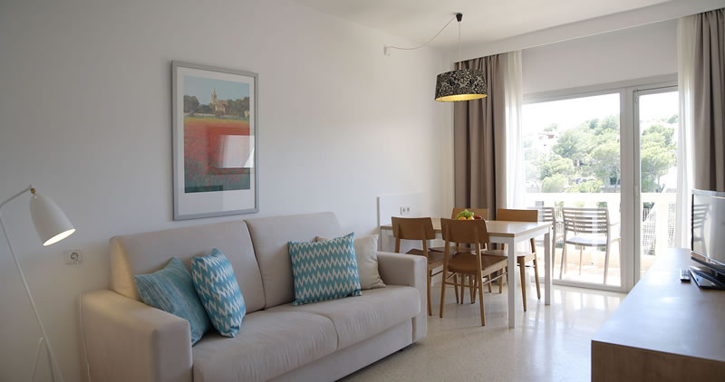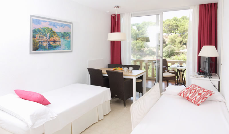 Im kinderfreundlichen Familienhotel Cala Santanyi wohnen Sie komfortabel und gemütlich direkt an der wunderschönen, feinsandigen und flach abfallenden Bucht von Cala Santanyi. Das Hotel besteht aus 2 Gebäudeteilen mit insgesamt 72 Wohneinheiten. Das Hauptgebäude liegt direkt am Strand und beherbergt die schicken Juniorsuiten und Suiten mit Balkon und direktem Meerblick. Die Suiten sind ausgestattet mit zwei Grandlits (je 135 x 200 cm), einer Sitzecke und Badezimmer. Ideal für Familien mit Kindern sind im nebengelegenen Appartementgebäude die Appartements mit 1 Wohn-/Schlafraum und 1-2 separaten Schlafzimmern, Küche oder Kitchenette, 1-2 Badezimmer und Balkon oder Terrasse mit seitlichem Meerblick. Für Kleinfamilien (max. 2 Personen) eignen sich die Studios mit Landblick gut, ebenfalls mit Küche oder Kitchenette, 1 Badezimmer und mit oder ohne Balkon buchbar. Alle Wohneinheiten sind ausgestattet mit Bettwäsche und Handtüchern, Klimaanlage/Heizung, Safe, Kühlschrank, Sat- Fernseher, Fön & Telefon und kostenfreiem WLAN. Hier finden Sie eine kleine Detailinfos zu den Wohneinheiten