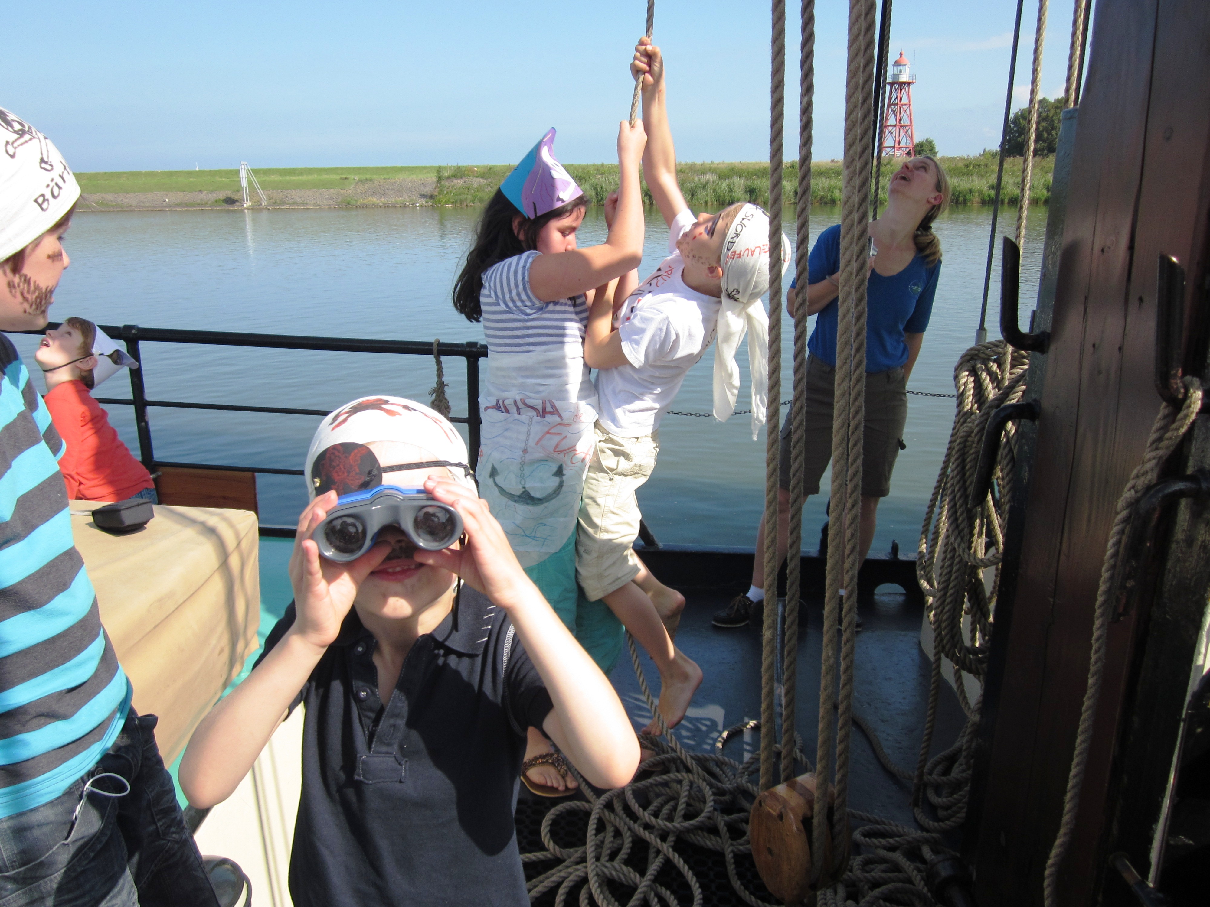 Kinder und Jugendliche kommen bei diesen Törns voll auf ihre Kosten. Sie sind aktiv dabei, wenn Segel gehisst, Schwerter gekurbelt und Manöver gefahren werden. Natürlich dürfen sie auch das Ruder führen. Ein spannendes Erlebnis ist eine kleine Kletterpartie in den Klüverbaum oder z.B. ein Piratentag an Bord. Und unter Deck ist auf Plattbodenschiffen viel Platz, so dass bei längeren Schlägen gespielt werden kann. An Land locken breite Sandstrände (Terschelling), kleine Radausflüge und vielen Museen.