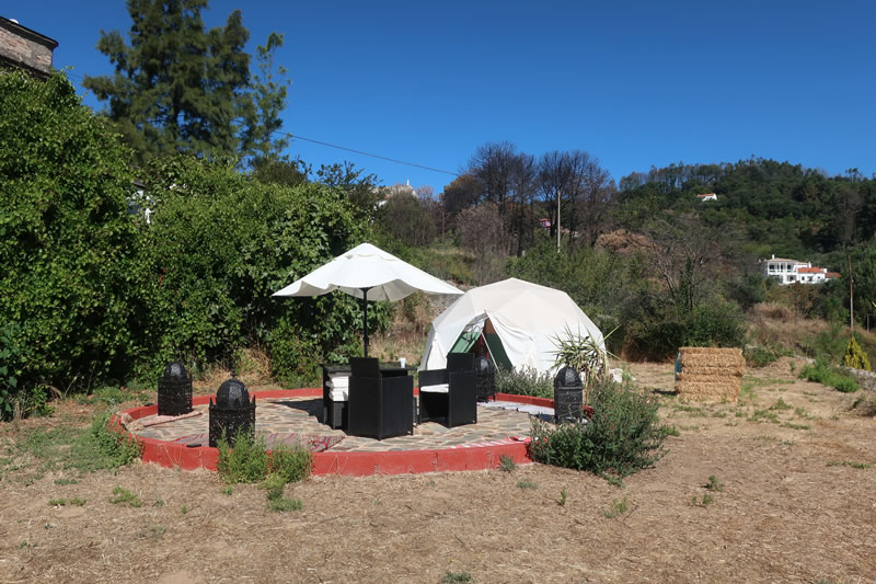 Die Quinta steht eingebettet in einem weitläufigen, naturbelassenen Garten mit Bio-Pool, Liegewiesen, Obstbäumen, gemütlichen Lauben, Teich und Yogaplatz. Das Haupthaus wurde detailgetreu im traditionellen Stil restauriert und zum Gästehaus mit einfach eingerichteten Gästezimmern umgestaltet. Es gibt 3 Doppelzimmer mit jeweils eigener DU/WC (ca. 16-21 qm; teilweise mit Zustellbett), 2 Dreibettzimmer mit jeweils eigener DU/WC und ein Doppelzimmer mit Gemeinschaftsdusche/WC, die sich außerhalb des Gebäudes befinden. Im Nebengebäude befinden sich 3 Maisonette- Zimmer (ca. 30 qm mit 1 Doppelbett im unteren Bereich, 2 bzw. 3 Einzelbetten auf einer Schlafempore und DU/WC), die Platz für bis zu 5 Personen bieten. Zusätzlich bieten 2 kleine Häuschen ausgestattet jeweils mit 1 Doppelbett, 2 Einzelbetten und ggfls. 1 Zustellbett auf einer Schlafempore, Küchenzeile und DU/WC Platz für jeweils 4-5 Personen. Im Garten befinden sich 2 geodätische Kuppeln mit Leinencover (ca. 13 qm), die mit 2 Betten (und ggfls. Zustellbett) ausgestattet sind. 2 Duschen/WC für ein Doppelzimmer und die Kuppel sind auf dem Gelände. Der Wintergarten und ein Billardzimmer bieten einen gemütlichen Rahmen für Gespräche.
