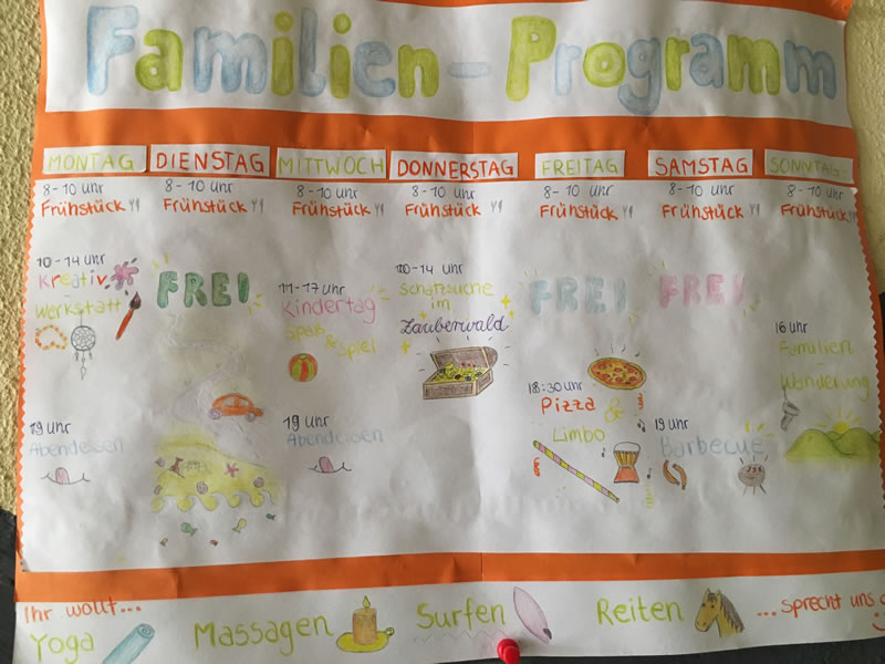 An drei Tagen gab es Kinderbetreuung, die sehr kreativ und liebevoll gestaltet wurde. Es gab eine Schnitzeljagd, Kennenlernspiele, Malen, einen Parcours und vieles mehr. Mittagessen für die Kinder war an den Tagen enthalten.
