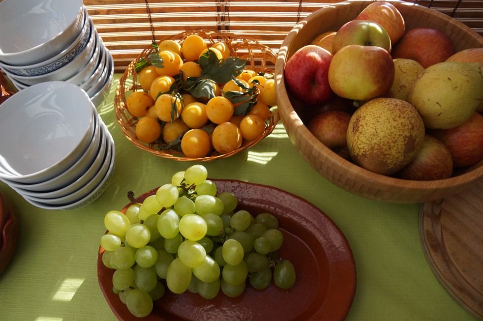 Genießen Sie in Ihrem Familienurlaub in Portugal schon nach dem Aufstehen die Aussicht auf die Berge. Das Frühstück wird je nach Wetterlage vor oder im Wintergarten serviert. Das Abendessen findet gemeinsam mit allen Gästen statt. Köchin Ania verarbeitet am liebsten erntefrisches, regionales Obst und Gemüse. Beim Kochen lässt sie ihrer Kreativität freien Lauf und überrascht immer wieder mit köstlichen veganen und vegetarischen Leckereien, die auch Nichtvegetarier und Kinder überzeugen. An 1-2 Abenden pro Woche kommen auch Fleisch- und Fischliebhaber auf ihre Kosten, z.B. wenn der Grillmeister den Churrasco einheizt und Sie mit portugiesischen Fleischgerichten verwöhnt, die dann zusätzlich zu den vegetarischen Gerichten zubereitet werden.
