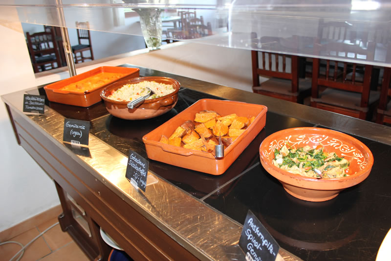 Die köstliche vegetarisch-vegane Vollverpflegung genießen Sie im Restaurant mit Terrasse und schönem Blick auf das Dorf Montuiri und die sanften Felder der Umgebung. Vom Buffet genießen Sie morgens bis 11 Uhr Tee, Kaffee, Fruchtsäfte, verschiedenste Milchsorten, frische Früchte, Yoghurt, hausgemachte Marmeladen, Porridge, teils hausgebackene Brotsorten, Käsesorten aus der Region, Aufstriche u.v.m.. Das späte Mittagessen um 14 Uhr besteht aus frischem Salat und köstlicher Suppe. Beim Abend-Buffet warten auf Sie frisch zubereitete vegetarisch-vegane Speisen.