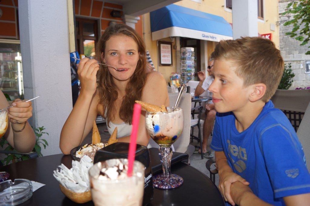 Die Region Istrien besitzt ein vielfältiges Angebot an Unternehmungsmöglichkeiten: An einem Tag besichtigten wir die Stadt Pula mit ihrem Amphitheater. Natürlich unternahmen wir auch einen Stadtbummel durch die Altstadt von Labin. Außerdem wanderten wir auf den Vojak, auf dem Weg der sieben Wasserfälle, durch die Vela Draga Schlucht und von Labin zur Adria nach Rabac, wo uns der Strand aber eindeutig zu überfüllt war. Da zogen wir lieber die felsigen Badebuchten in Sveta Marina zum Schnorcheln und Schwimmen vor, an denen wir immer mal wieder einen ganzen Tag verbrachten. Oft kamen wir auch am Velo Kafe in Labin vorbei und probierten uns durch die leckeren Eissorten.