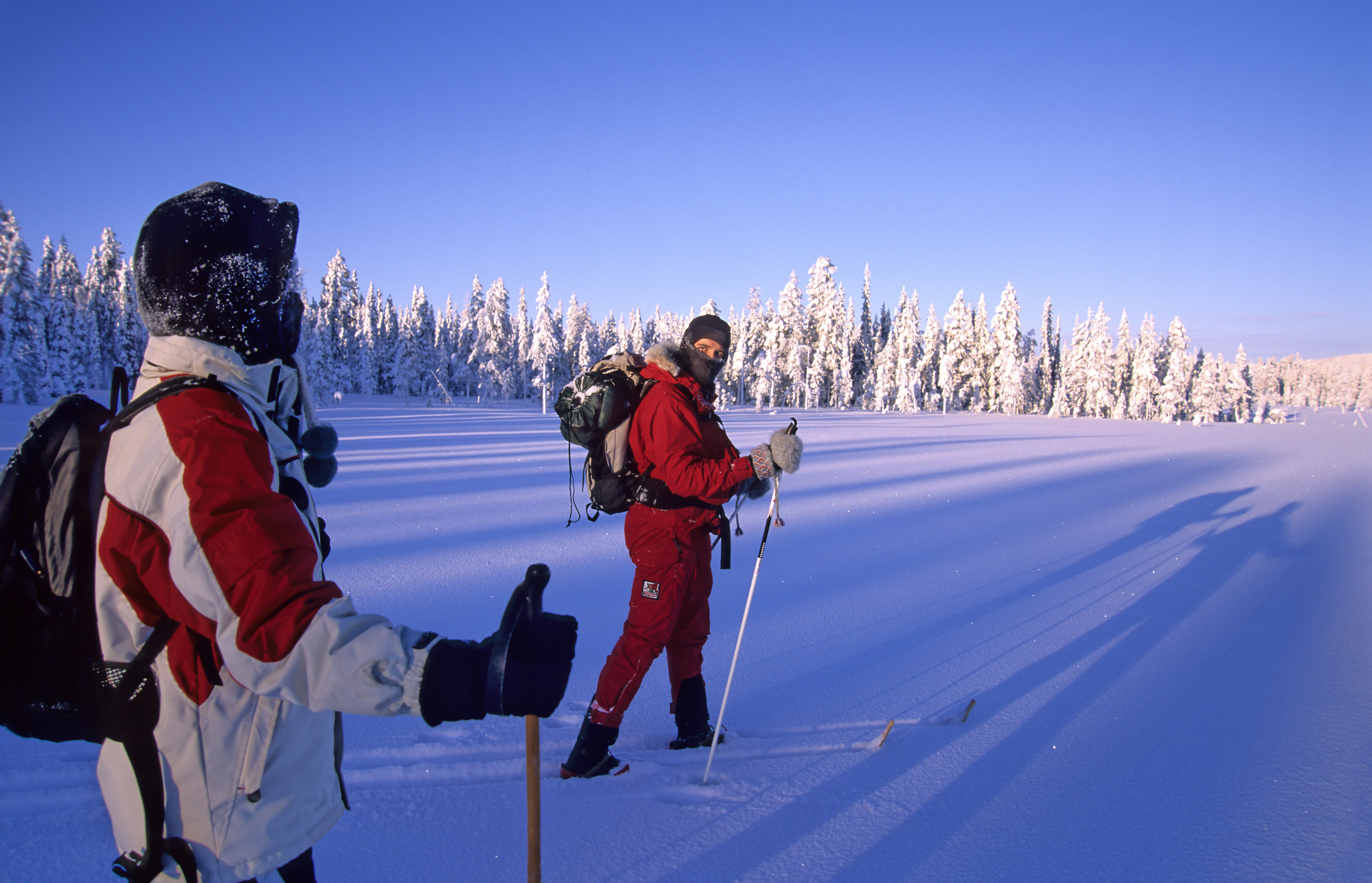 Heute sind wir den ganzen Tag auf Skiern unterwegs. Entweder wandern wir zu einem verlassenem Gehöft, einem Waldreservat oder auf den "Hausberg". Hier oben gibt es eine kleine Hütte, um im Warmen unser Vesper einzunehmen, und einen Aussichtsturm, um einen Blick in die Weite zu werfen. Am Abend bekommen wir dann Besuch vom Nachbar Lars, der uns mit Erzählungen aus dem Leben der Rentierzüchter am Lagerfeuer in der Kote unterhält. Lars hat sein Leben lang als Rentierzüchter seinen Lebensunterhalt verdient und kann deshalb sowohl aus dem Leben der Samen von heute als auch von früher erzählen. Sicherlich werden wir an diesem Abend auch einen samischen Jojk hören.