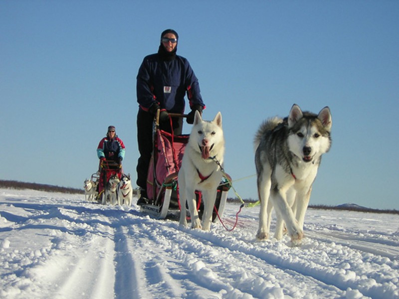 Durch Wälder und über zugefrorene Sümpfe steuern wir die Hundeschlittengespanne entlang zu einer Hütte oder einer Zeltkote, wo wir die Nacht verbringen werden. Nachmittags gibt es auch noch die Möglichkeit, sich im Schneeschuhlaufen zu erproben. Nach dem Versorgen der Hunde gibt es ein leckeres Abendessen. -