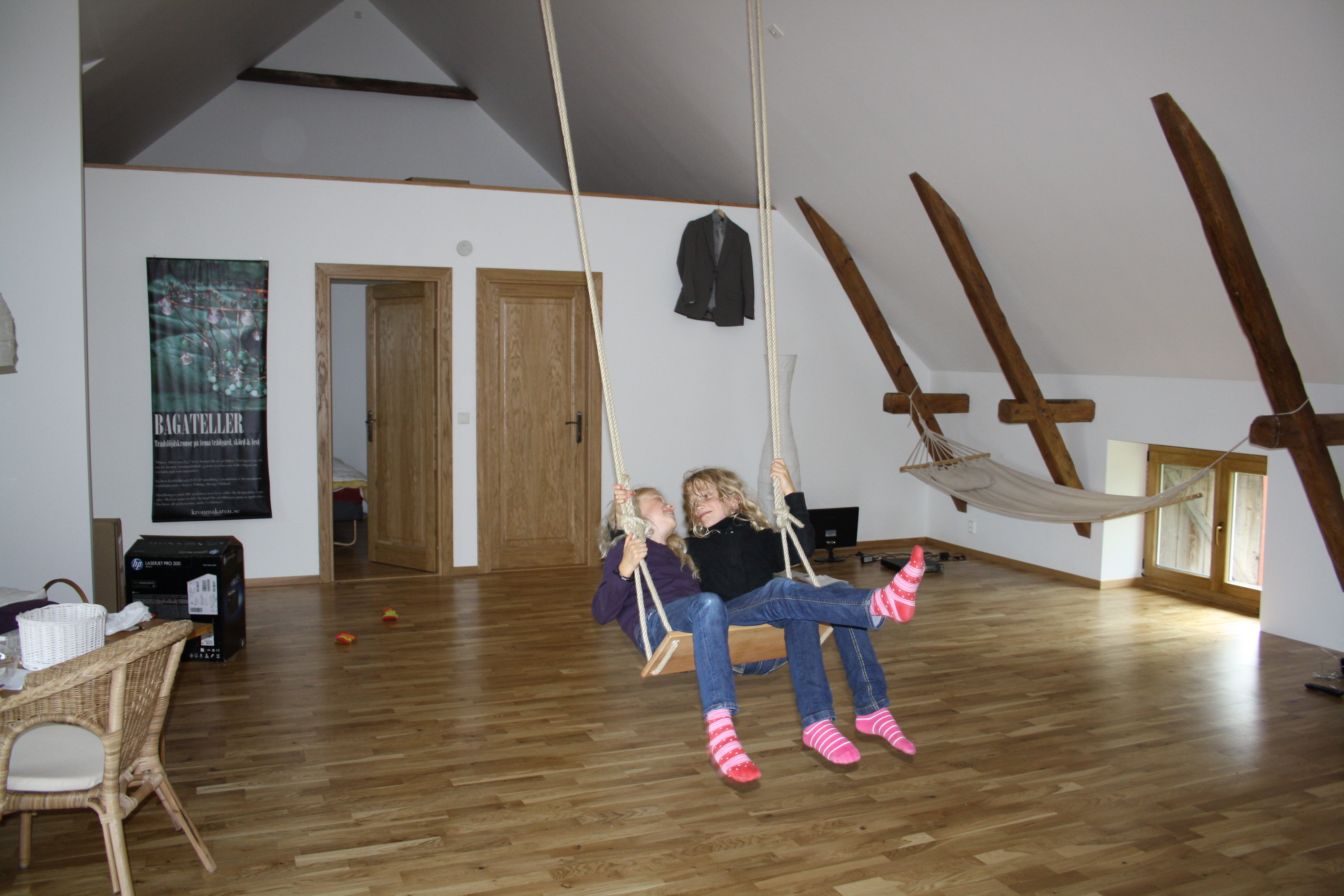 Bei Kindern beliebt sind das Baumhaus, verschiedene Spielgeräte und natürlich die Hoftiere. Ein Highlight bei den Erwachsenen ist die Baumhaus- Sauna.
