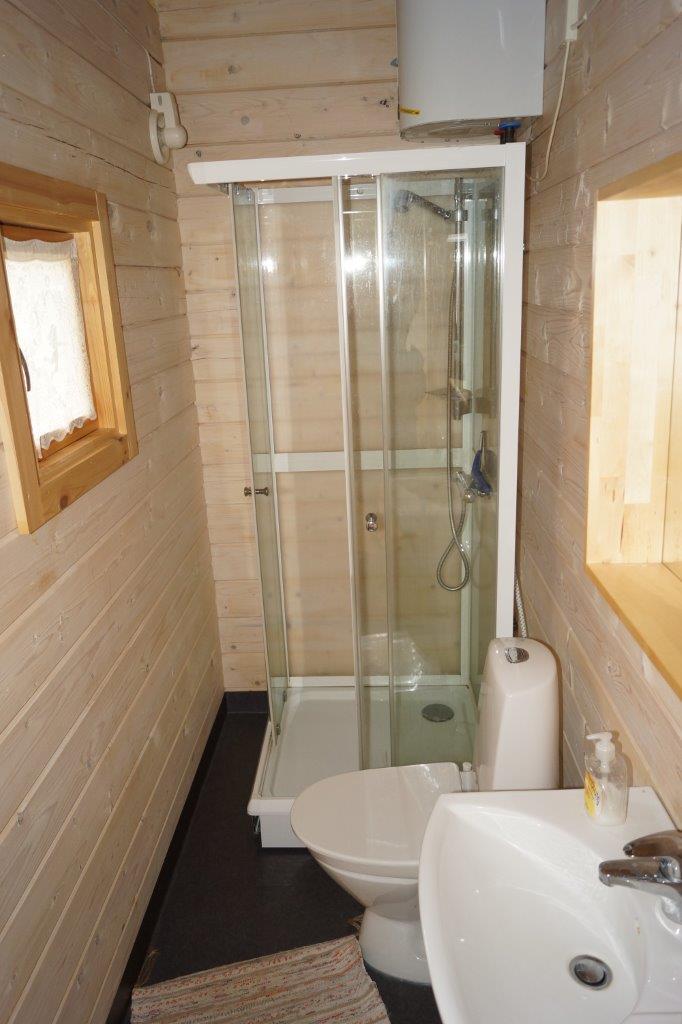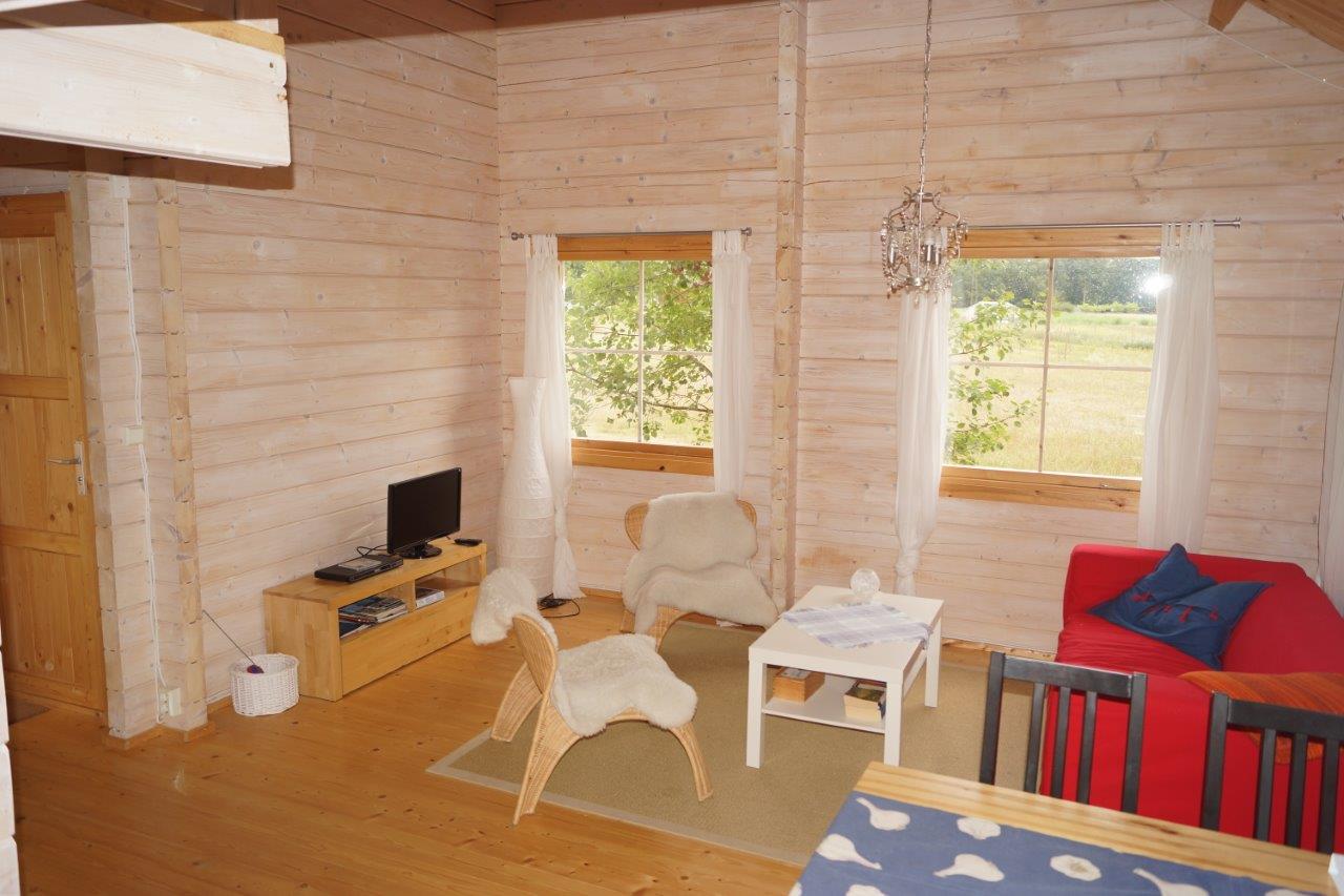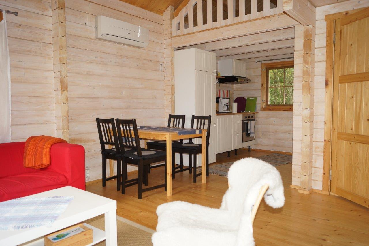 Drei je ca. 50 qm große Ferienhäuser für je bis zu vier Personen befinden sich ca. 200 m von den anderen Gebäuden des Bauernhofs entfernt, am Rande eines kleinen Wäldchens. Die modernen, im skandinavischen Stil eingerichteten Holzhäuser verfügen über eine voll ausgestattete Küche, ein Badezimmer mit Dusche/WC, ein Wohnzimmer mit einer Sitzgelegenheit zum Essen, ein Schlafzimmer mit zwei Betten und ein Schlafloft mit zwei Betten.