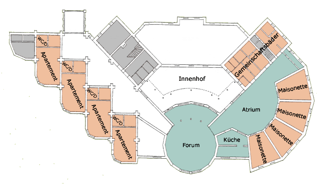 Alle acht Maisonettes sind nach außen hin zimmerhoch (Kuppel) bzw. giebelhoch (Gewölbe) verglast. Vom Wohnbereich gelangt man direkt in den kinderfreundlichen Grünbereich. Im Gästehaus stehen Gemeinschaftsräume, eine Tischtennisplatte und Spiele zur Verfügung.