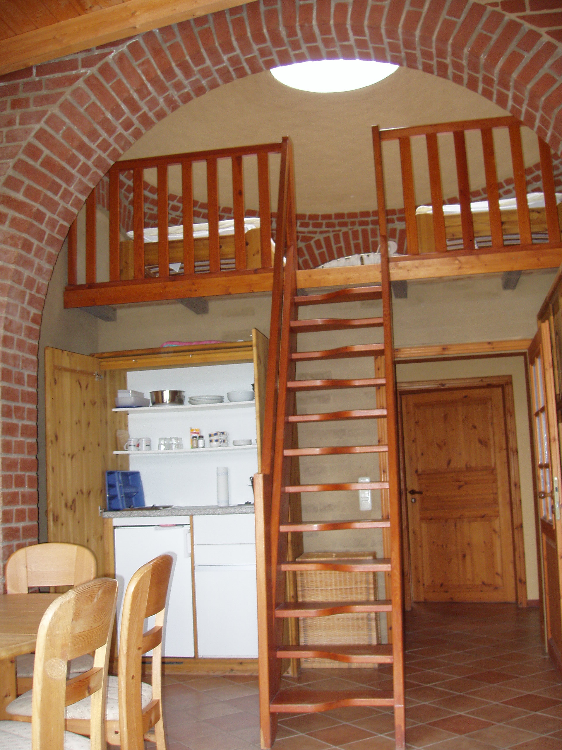Vier weitere Maisonettes sind in Kuppelbauweise (ca. 38 qm) errichtet und mit eigener DU/WC und Teeküche, bestehend aus zwei Kochplatten, kleiner Spüle & Kühlschrank mit teilweise Gefrierfach, ausgestattet. Auch in der Kuppelmaisonette befindet sich eine Schlafcouch für 2 Personen im Erdgeschoss und im oberen Bereich zwei Einzelbetten, die durch eine Raumspartreppe erreichbar sind.