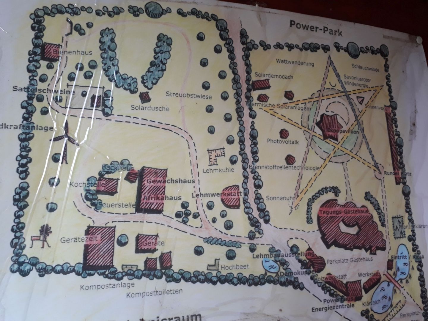 Hans-Jörg V.28.06.2022Ist schon alles speziell, der riesige Klimapark mit vielen interessanten Anregungen, die aber sicher oft im Alltag schwer umzusetzen snd. Man sieht, dass die Gastgeber mit sehr viel Engangement und v.a. Werner visionäre Ideen enwickelt und auch versucht "unter die Leute zu bringen": Er ist ja viel rumgekommen in der Welt, war jahrelang u.a. Entwicklungshelfer in Afrika. Die Unterkiunft erinnert natürlich an eine Jugenherberge und man muss sicher einige Abstriche an den gewohnten Komfort machen. Dass es nur einen Fernseher im Gemeinscahftsraum gibt und WLAN nur bedingt zur Verfügung steht ist ja wirklich zu verkraften, aber die Betten, die nur durch eine Sambatreppe zu erreichen sind und man direkt unter der Glaskuppel in dem in Lehmbauweise erbauten Haus.schläft und es somit im Sommer aber ca. 4.30 Uhr hell wird, ist sicher auch nicht für jeden was. Bei der Sauberkeit darf man auch nicht so genau hinsehen, im Kühlschrank war auch das Licht defekt etc. Der Preis ist jedoch für Unterkunft mit ausreichendem Frühstück angemessen. Glücksburg bietet außer dem Schloss incl. Rosarium und ein paar Geschäften incl. 2 Restaurants und einem großen Edeka nicht allzu viel. Wir haben, da wir mit dem Zug angereist sind -mit dem ÖPNV die Gegend erkundet wobei v.a. Flensburg eine schöne Stadt ist und so einiges bietet. Auch ducrh das recht wechselhadte Wetter hat sich eine Schiffahert bzw. baden im Meer nicht ergeben. Die Busfahrpläne sind z.T. auch schwer zu durschauen und z.T. widersprüchlich. Man muss sich vorher auf alle Fäle merken, wann es wieder zurück- bzw. weitergeht.Insgesamt haben wir uns recht gut erholt, wenn nicht die völlig chaotische Rückreise mit der Bahn gewesen wäre:)Schöne Unterkunft in ökologischem Gelände
