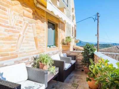 Über schmale, gepflasterte Gassen erreicht man das zweistöckige alte Steinhaus mit Panoramablick. Das großzügige Wohnzimmer mit der angrenzenden, voll ausgestatteten Küche und dem Essbereich befindet sich im erhöhten Erdgeschoss. In der Mitte des Raums führt eine Holztreppe ins Obergeschoss. Hier befinden sich die zwei Schlafzimmer - jeweils mit SAT-TV, eigener DU/WC und begehbarem Kleiderschrank. Das Ferienhaus ist ideal für einen Korfu-Urlaub mit Kindern. Das Elternschlafzimmer verfügt über einen eigenen Balkon. Wunderschöne Ausblicke auf die umliegende Landschaft und den Ort bieten sich von beiden Schlafzimmern. Der Balkon im Eingangsbereich des Hauses ist der richtige Ort, um entspannt den Tag zu beginnen und abends die unzähligen Sterne zu beobachten. Man blickt von hier auf den bewaldeten Bergrücken und die Dächer des Ortes.