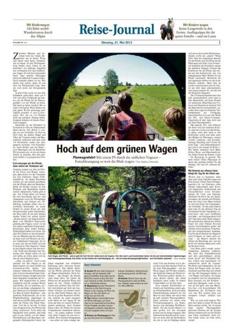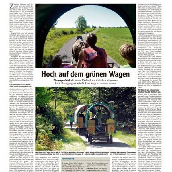 geraten. Manchmal hätte ich mir eine etwas modernere und praktischere Ausstattung der Roulotte gewünscht. Die Wagen sind sehr einfach und in die Jahre gekommen, dennoch war alles da was man brauchte. Die Stationen waren einfach und zweckmäßig, teilweise sehr schön gelegen. Bei allen Problemen oder Fragen haben uns Corinne und Thomas immer freundlich und schnell weitergeholfen. Es war ein schöner, abenteuerlicher und sehr besonderer Urlaub.PresseberichteFamilienurlaub in Frankreich: Mit dem Planwagen durch die Vogesen
