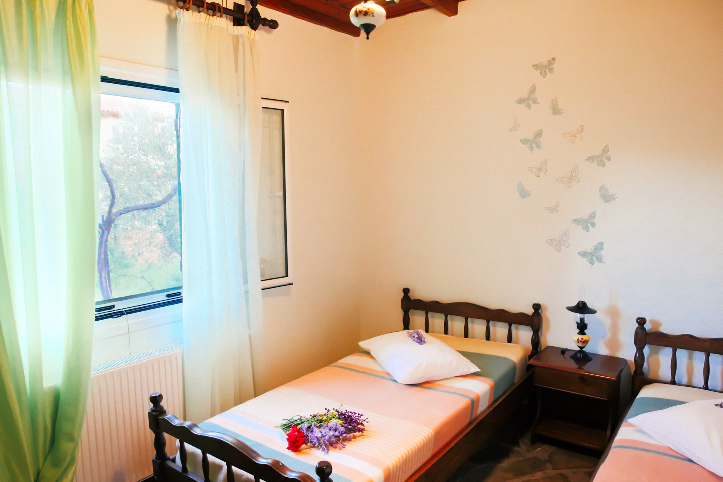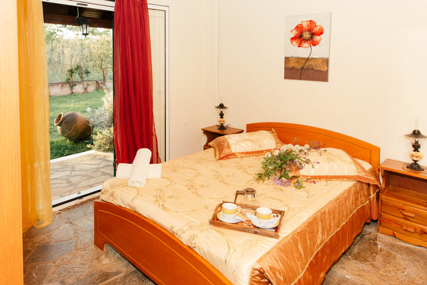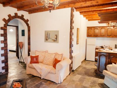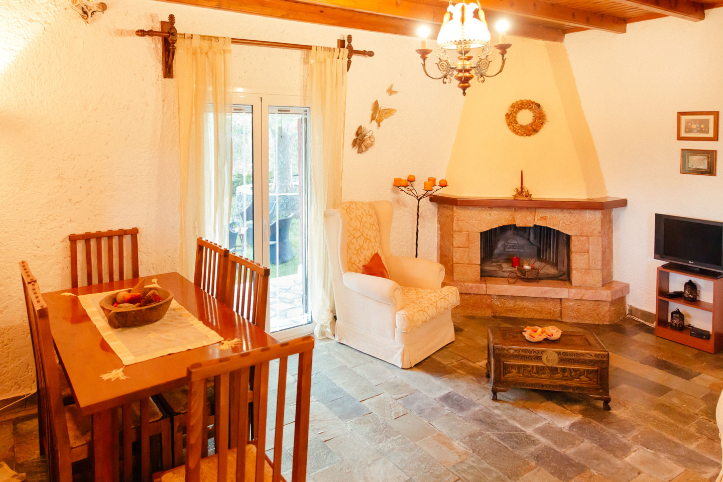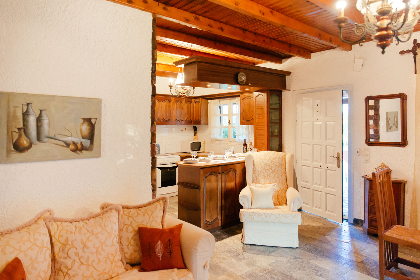 Die Veranda, die um eine Längs- und ein Querseite der Ferienvilla läuft, führt sowohl in den großen Wohn-Ess-Küchenbereich als auch direkt in das Schlafzimmer mit Doppelbett. Zwei weitere Zimmer mit jeweils zwei Einzelbetten vervollständigen den Schlafbereich der Villa Platani im Süden Korfus. Ein Kamin im Wohnbereich sorgt auch an kühleren Abenden für Wärme und Behaglichkeit. Der offen gestaltete Bereich wurde mit stabilen Holzmöbeln und bequemen Sesseln, einem Sofa und vielen weiteren Details eingerichtet. Die offene Küche ist mit den wichtigsten technischen Geräten ausgestattet, die Sie benötigen, um auch im Urlaub Ihre Familie oder Freunde versorgen zu können.