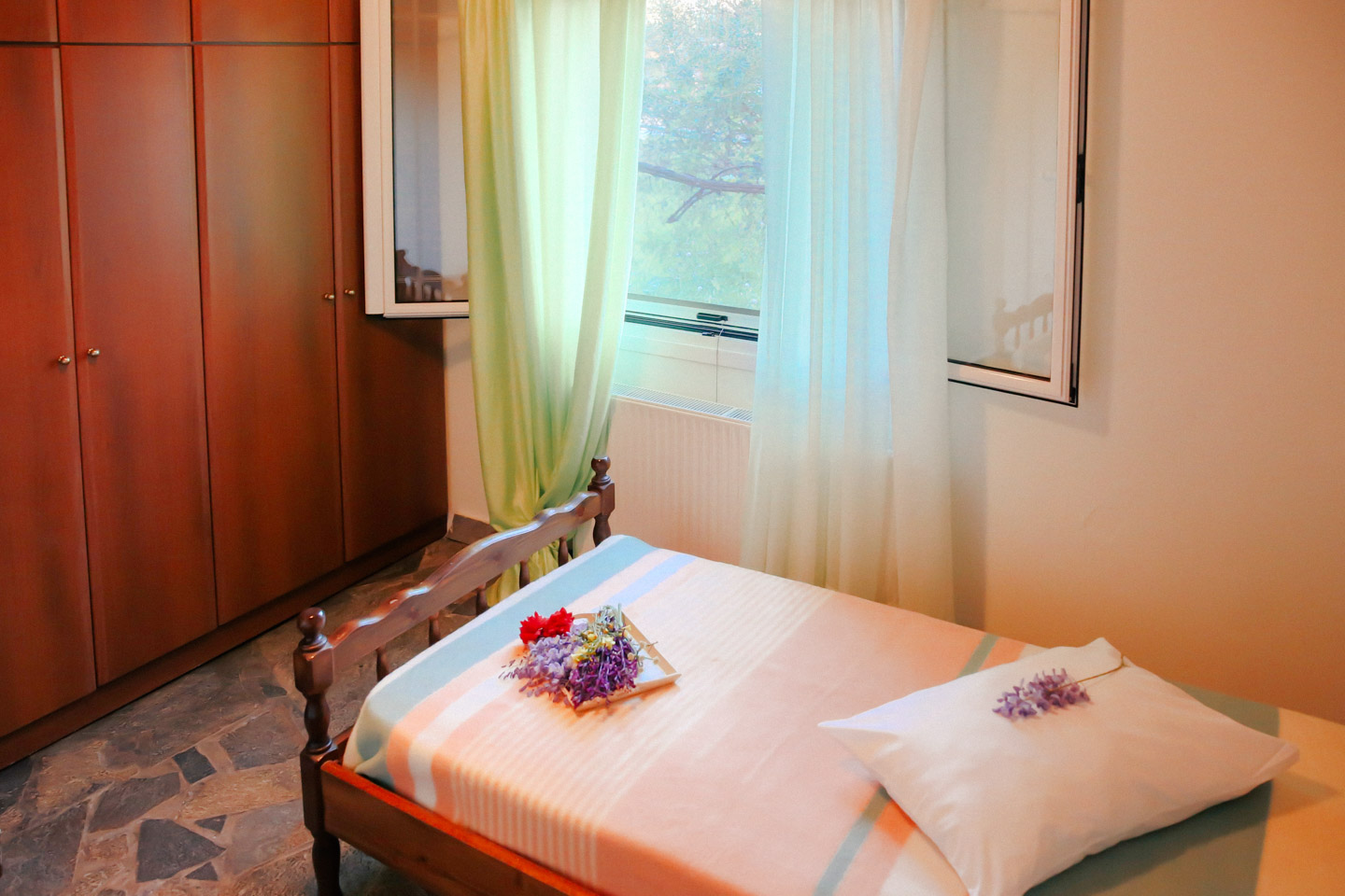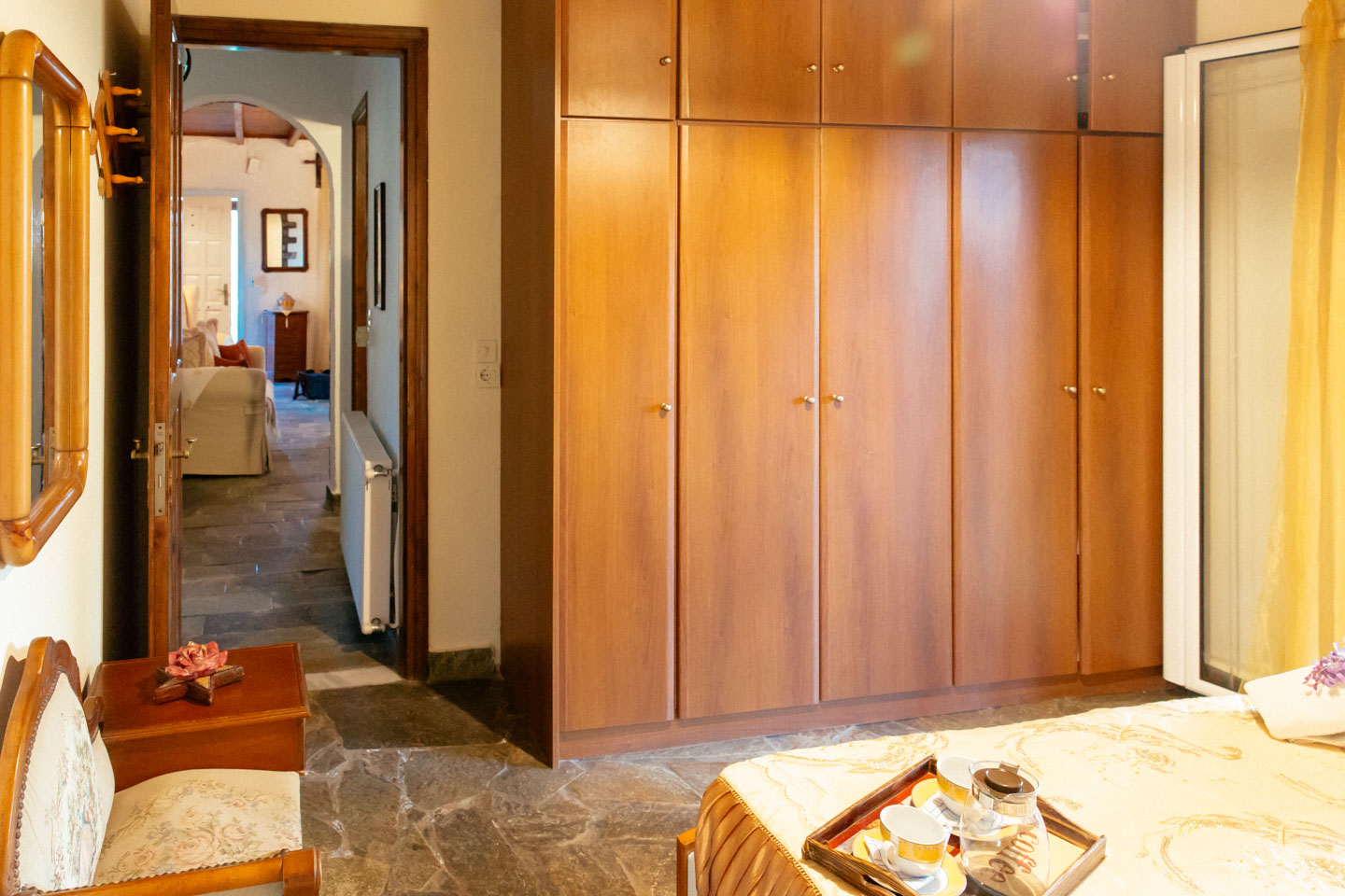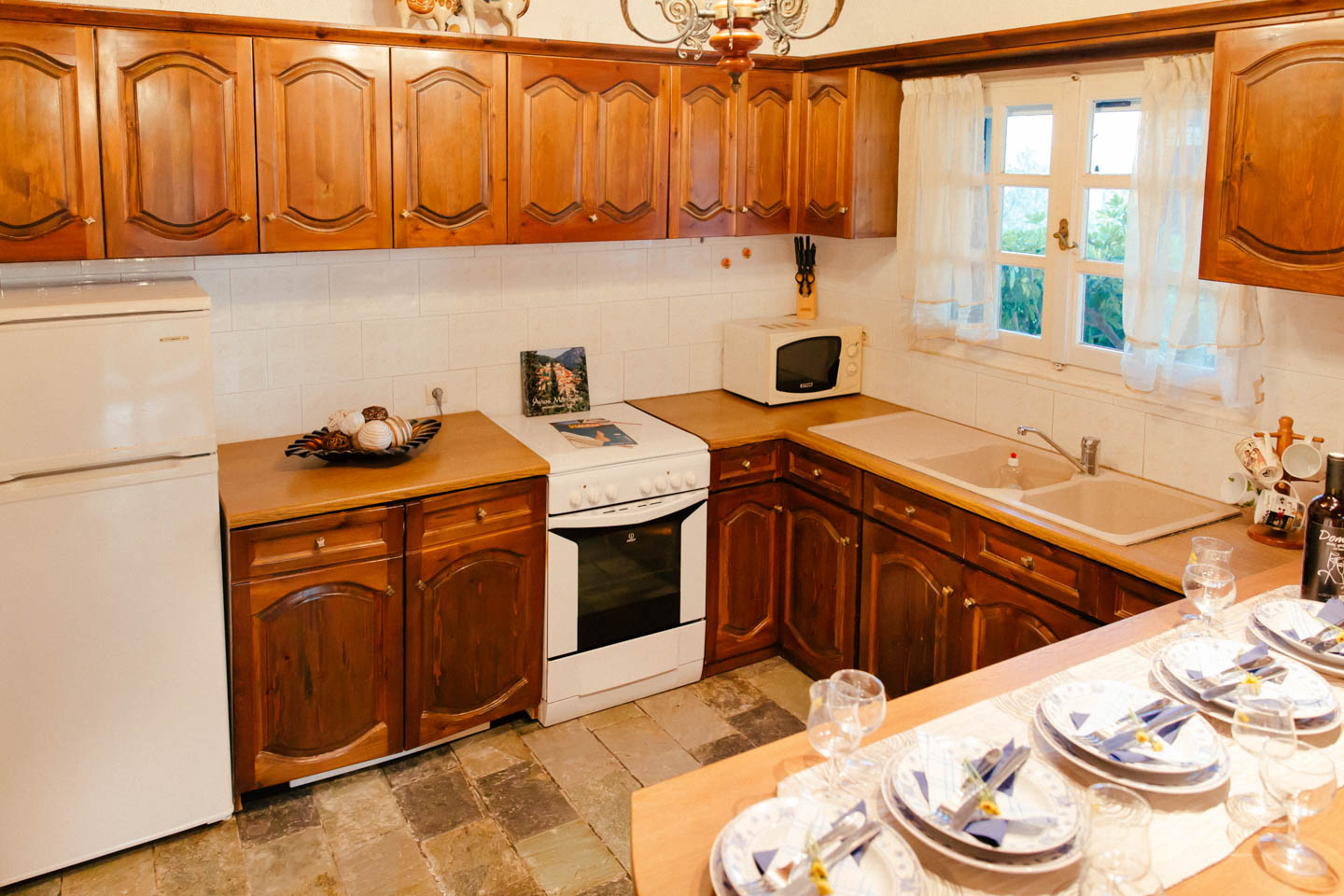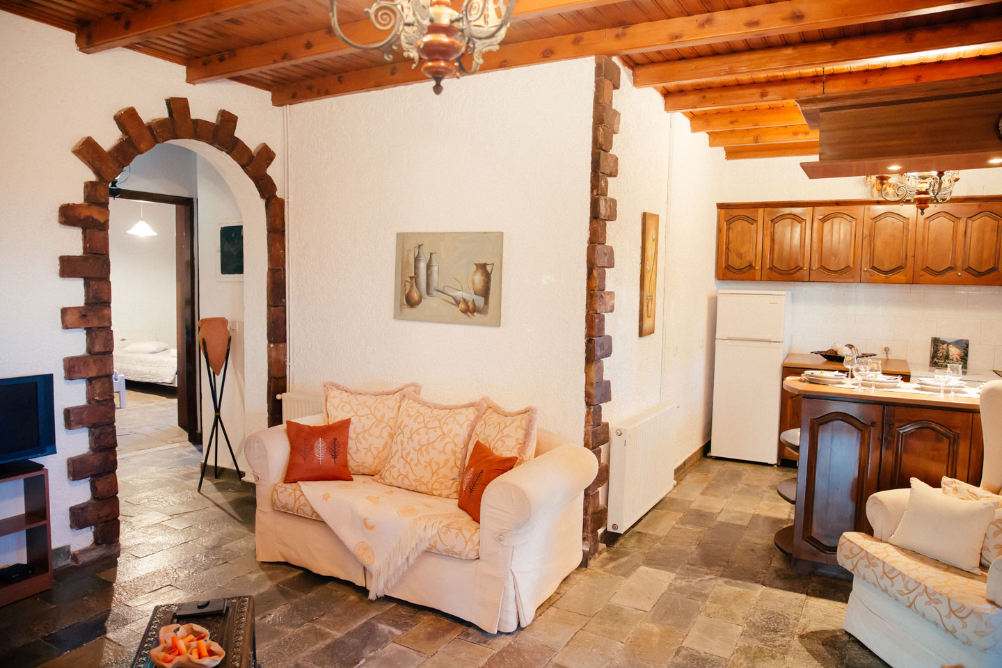 Die Veranda, die um eine Längs- und ein Querseite der Ferienvilla läuft, führt sowohl in den großen Wohn-Ess-Küchenbereich als auch direkt in das Schlafzimmer mit Doppelbett. Zwei weitere Zimmer mit jeweils zwei Einzelbetten vervollständigen den Schlafbereich der Villa Platani im Süden Korfus. Ein Kamin im Wohnbereich sorgt auch an kühleren Abenden für Wärme und Behaglichkeit. Der offen gestaltete Bereich wurde mit stabilen Holzmöbeln und bequemen Sesseln, einem Sofa und vielen weiteren Details eingerichtet. Die offene Küche ist mit den wichtigsten technischen Geräten ausgestattet, die Sie benötigen, um auch im Urlaub Ihre Familie oder Freunde versorgen zu können.