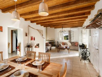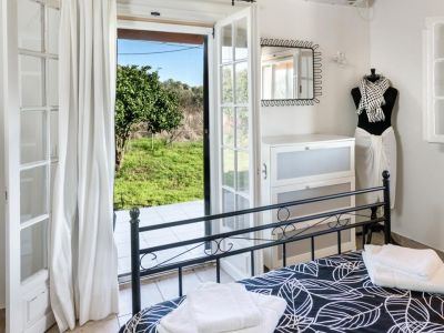 Im Erdgeschoss befindet sich das große helle Wohnzimmer mit Kamin und die voll ausgestattete Küche mit Geschirspülmaschine. Beide mit direktem Ausgang auf eine der Terrassen. An das Wohnzimmer schließen sich zwei Schlafzimmer mit jeweils einem Doppelbett sowie das gemeinsame Bad an. Jedes Schlafzimmer verfügt über einen eigenen Zugang auf die hintere Terrasse und den mediterranen Garten.