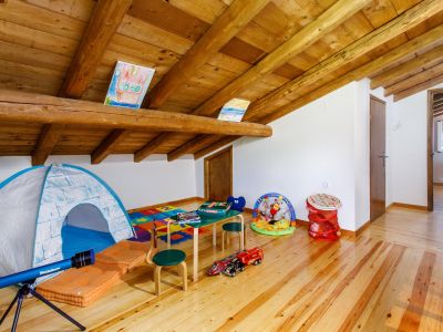 Ins Obergeschoss führt eine Holztreppe. Dort befindet sich das Spielzimmer, ein zusätzliches gemeinsames WC und zwei großräumige Schlafzimmer mit einem Doppelbett bzw. einem Doppelbett, Schlafsofa und Holz-Kinderbett. Außerhalb des Hauses gibt es einen Grill und eine Essecke mit Tisch und Stühlen für 6 Personen.