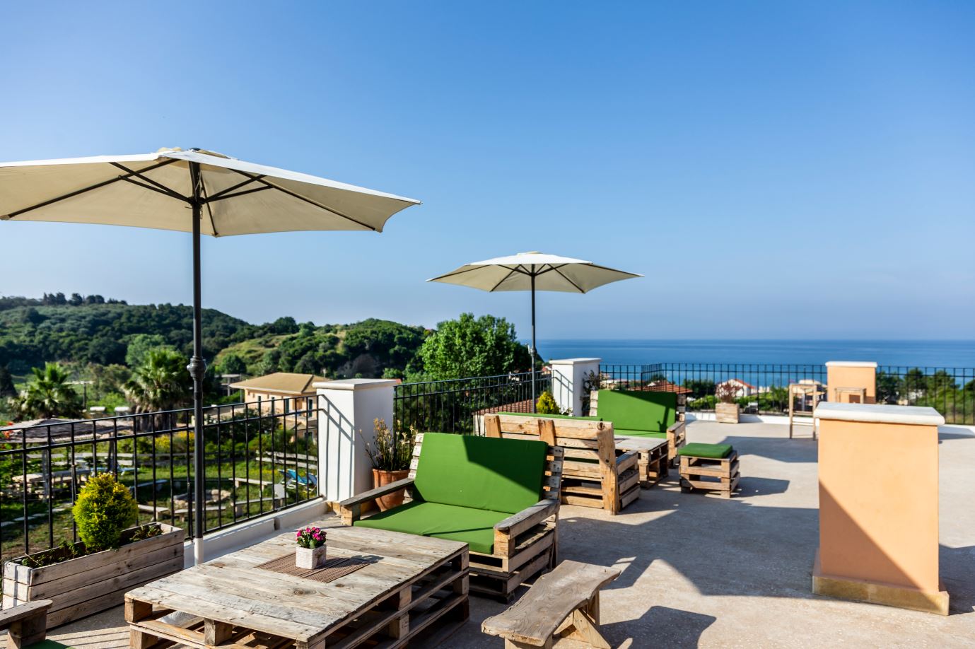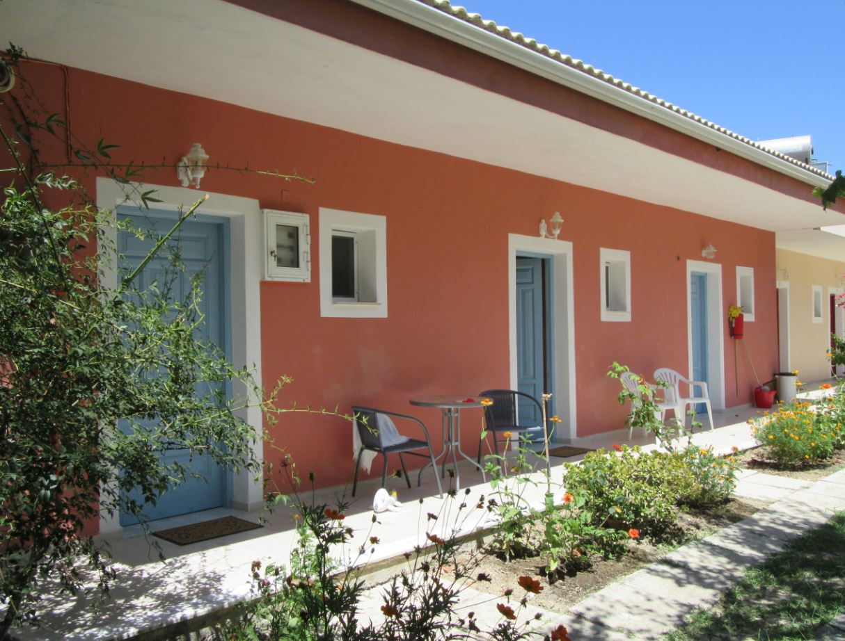 Alle Wohneinheiten des Hauses blicken zum Meer. Es gibt acht Studios und fünf Wohnungen. Die ca. 18 qm großen Zweibett-Studios verfügen über einen Balkon oder Terrasse, Kühlschrank, Klimaanlage (kostenpflichtig) und Badezimmer mit Dusche/WC. Ein Zustellbett ist in den meisten Studios möglich. Größere Familien mit Kindern können zwei Studios nebeneinander mit Verbindungsbalkon nutzen. Die ca. 36 qm großen Wohnungen besitzen zwei Schlafzimmer, einen kleinen Vorraum, Kühlschrank, Klimaanlage (kostenpflichtig) und ebenso Badezimmer mit Dusche/WC sowie einen großen Balkon oder Terrasse. Die Wohneinheiten verteilen sich auf Erdgeschoss und Obergeschoss. Wer sich mittags selbst etwas kochen möchte, kann eine der zwei Gemeinschaftsküchen nutzen.