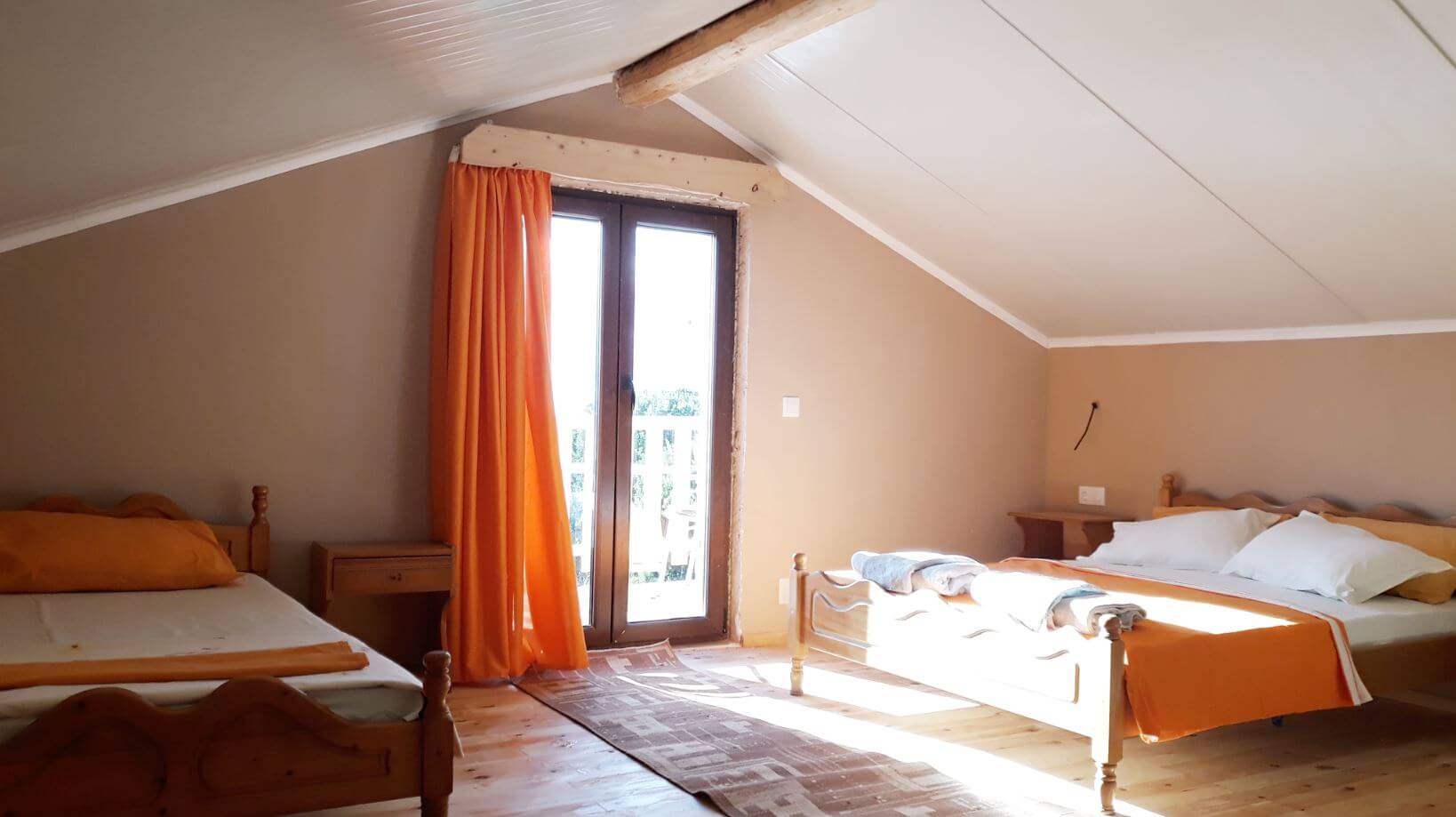 Das Haus Spyros verfügt über sechs einfache ca. 20 qm große Studios für 1-3 Personen mit einem Doppelbett und ggfls. einem Zustellbett, Kochzeile, Badezimmer und Balkon. Zur Villa KaliMeera sind es ca. 130 m Fußweg und zum Strand ca. 280 m.Eine ganz besondere Lage hat das alleinstehende Ferienhaus Kostas, mit grandiosem Blick über die Bucht und zum Meer. Das Haus aus Stein (65 qm) bietet einen Wohnraum mit Sitzecke, Kamin, Kochzeile sowie Badezimmer. Unter dem Dach befindet sich ein offener Schlafbereich mit 1 Doppelbett, 2 Einzelbetten und ggfs. einem Zustellbett. Der Schlafbereich ist über eine Wendeltreppe erreichbar (nicht kleinkindgerecht). Der Fußweg von der Villa KaliMeera führt ca. 180 m durch den großen Garten mit Olivenbäumen. Zum Meer sind es ca. 150 m.