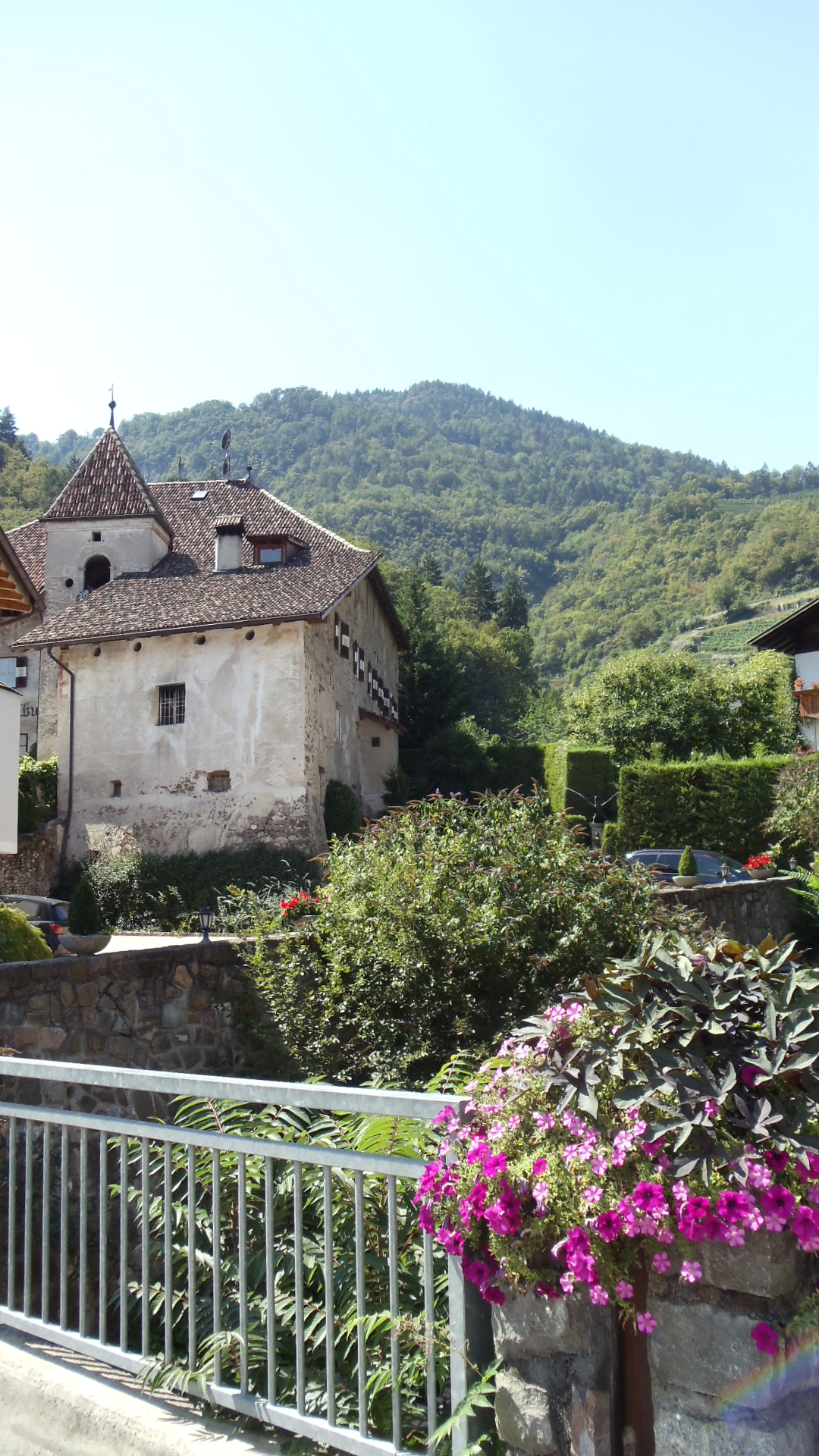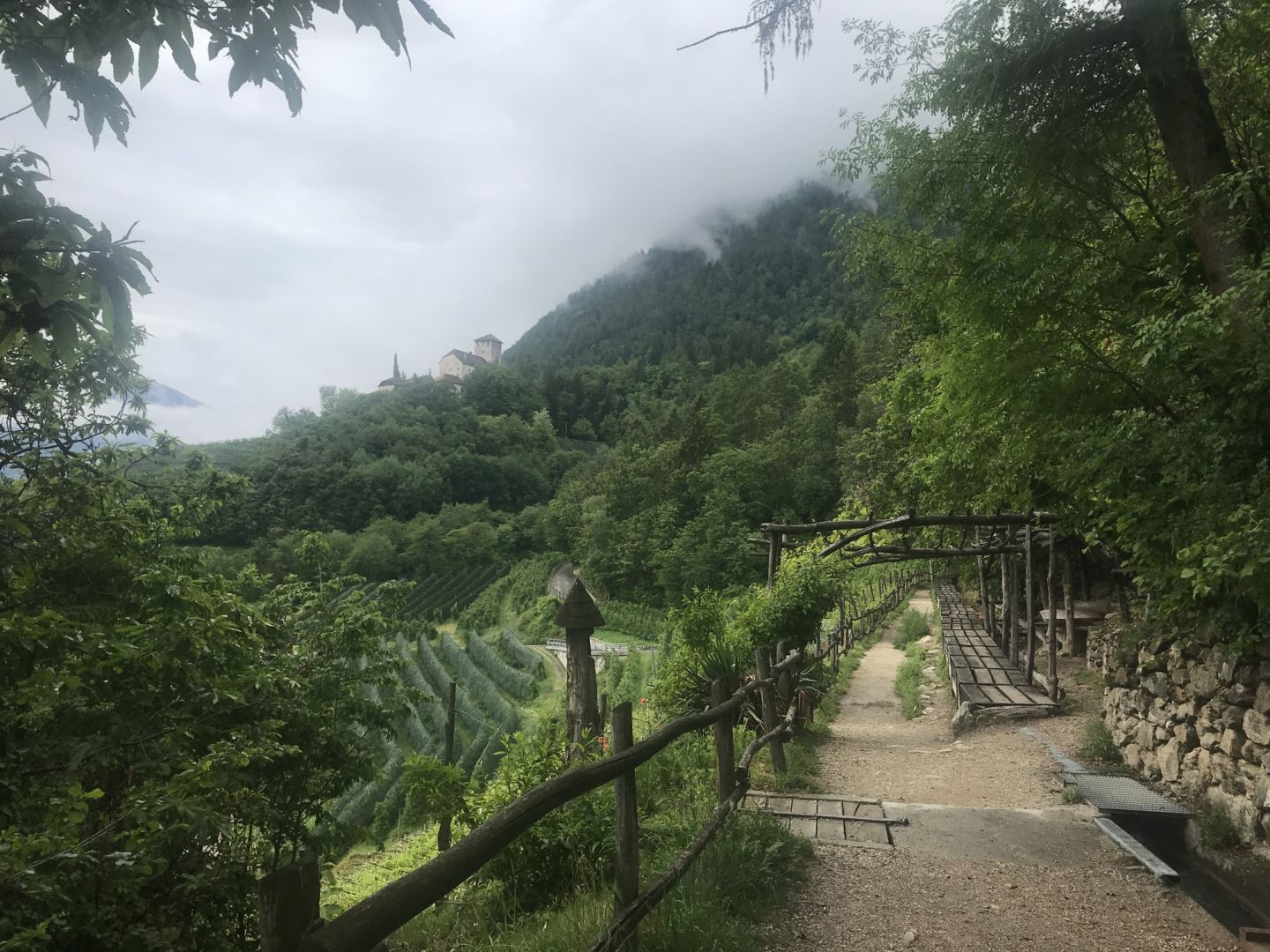 Am zweiten Wandertag, von Nals nach Kaltern, auf dem Burgenweg, hat man echt zu tun mit auf und ab und der Überwindung unheimlicher Schluchten. Aber die Burgen sind schön, gut gepflegte Ruinen und man kann einkehren. Vom Aussichtsturm von Schloss Boymont lag die Landschaft unter mir wie ein Teppich, zierlich geordnet die Dörfer, Gehöfte, Weinberge, Wasserreservoir. Dass man sich nicht sattsehen kann, das traf hier zu. Und hinten, im Dunst, die Zacken der Dolomiten. Am Ende des Tages wurde mir der Weg etwas lang, da fehlte ein Hinweis, wo man noch mal Kaffee trinken kann, ein kleiner Schub für die letzten vier km vorbei an den Eislöchern. Aber im Hotel Tannhof wieder mit dem Blick auf ein großartiges Panorama gewohnt.