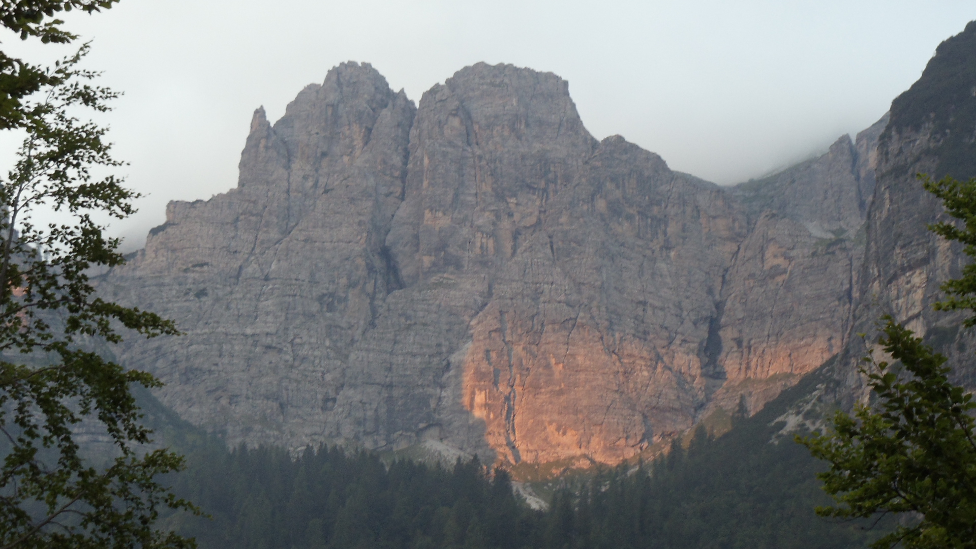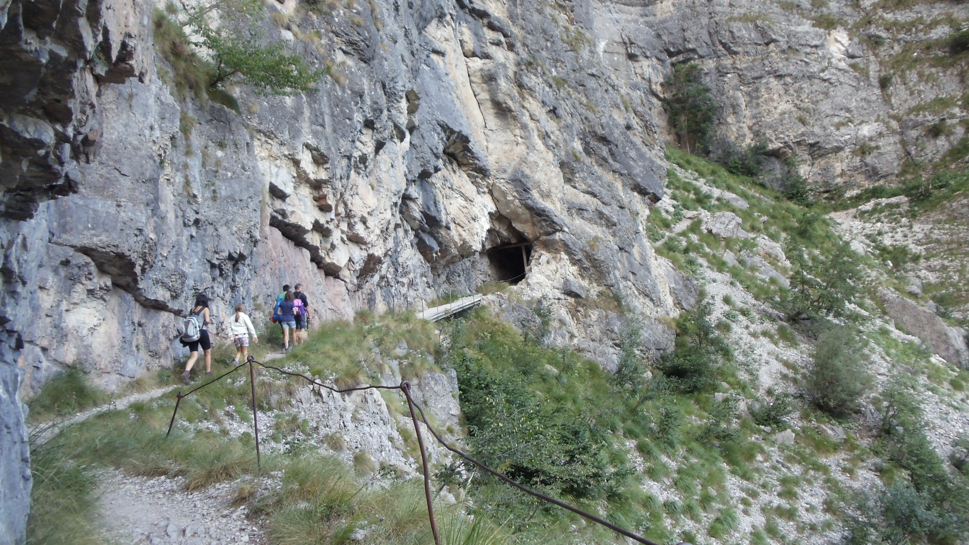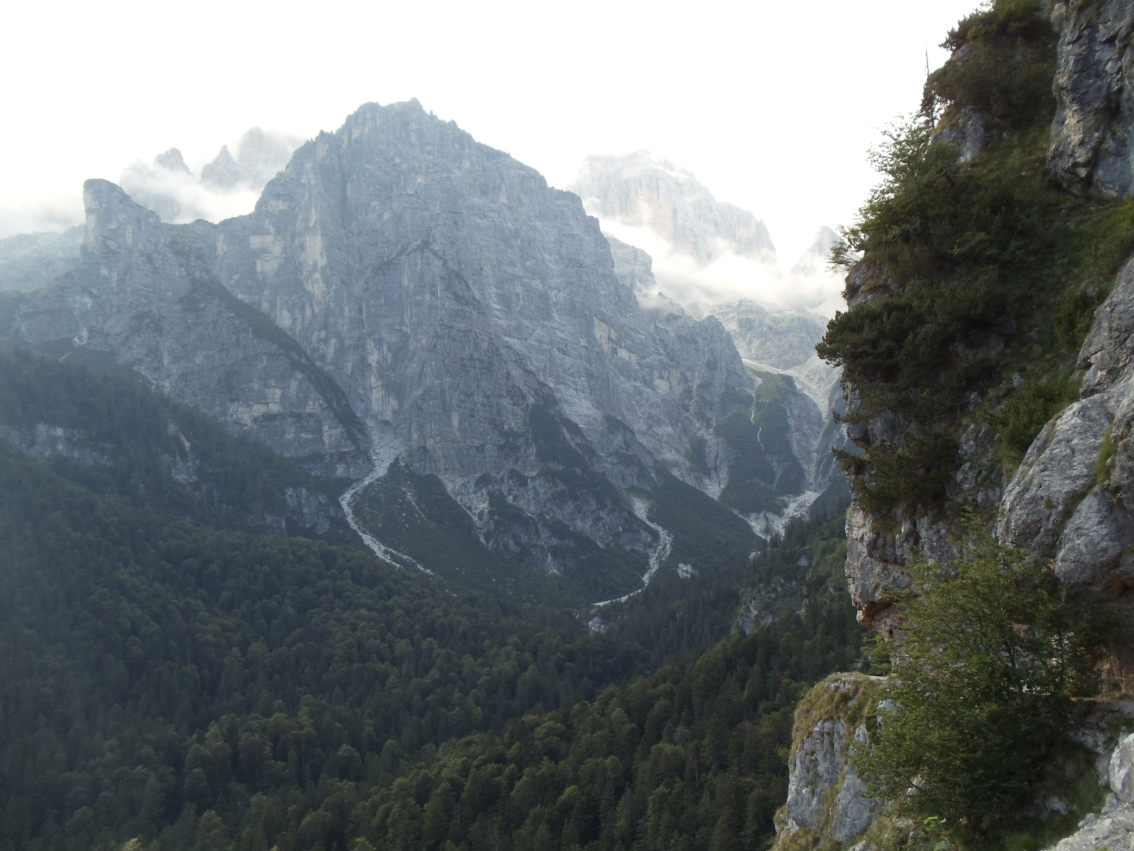 Am ersten Refugio, wo es möglich war, auf einen Weg zum Lago de Molvena abzubiegen, hatte ich Lust noch weiter auf dem Höhenweg, dem Standardweg zu bleiben, allerdings nicht alleine. Es fand sich eine Mitwanderin. Es wurde schon etwas spektatulär, teilweise ist der Weg sehr schmal, unterbrochen und wir waren äußerst froh über Stahlseile zum Festhalten. An einer Alm fing es an zu regnen, nicht so schön, noch über zwei Stunden Weg bis zur Bushaltestelle im Regen. Gut, dass es an der Haltestelle eine Bar gab, wo wir zu zweit flugs mit unserem nassen Zeug viele Stuhllehnen behängt haben. Heißen Tee getrunken.