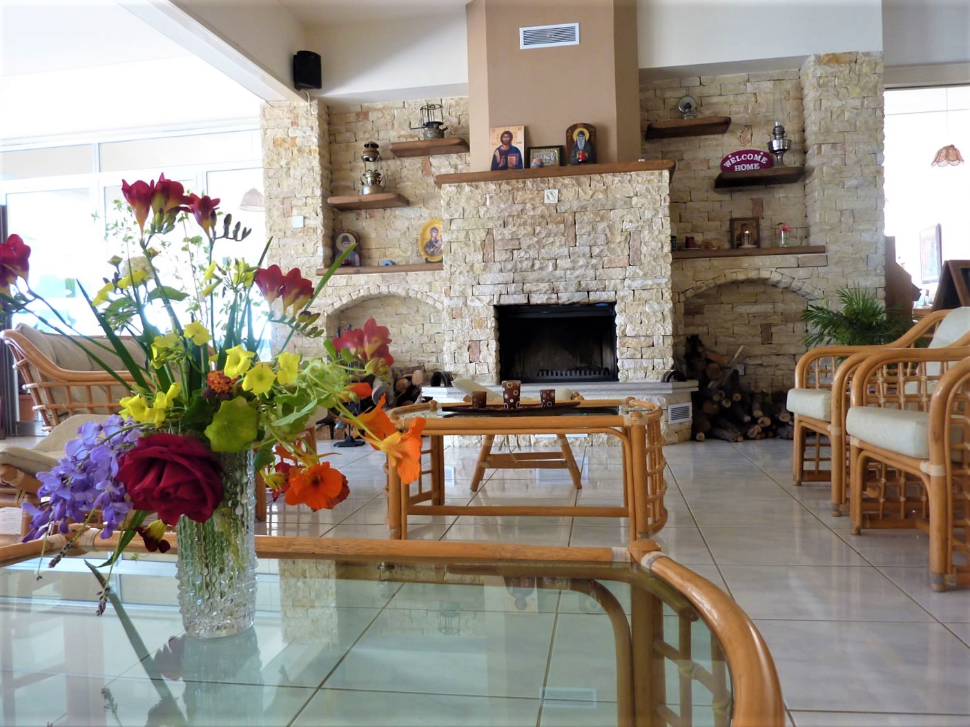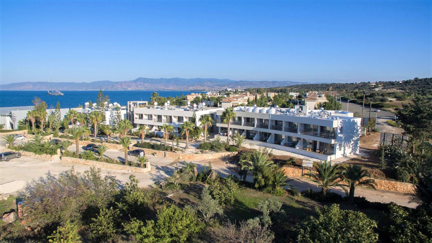 In den vier zweistöckigen Gebäuden, die von einem kleinen Garten umgeben sind, befinden sich insgesamt 96 komfortable und geräumige Zimmer. Alle Zimmer sind mit Dusche, WC, Balkon oder Terrasse ausgestattet, die meisten davon mit seitlichem Blick auf das Meer. Jedes Zimmer verfügt über eine Klimaanlage, mit der sowohl gekühlt als auch geheizt werden kann. In der offenen Empfangshalle befinden sich die Rezeption, eine Bar und “Chill-Lounge” mit Internetempfang.
